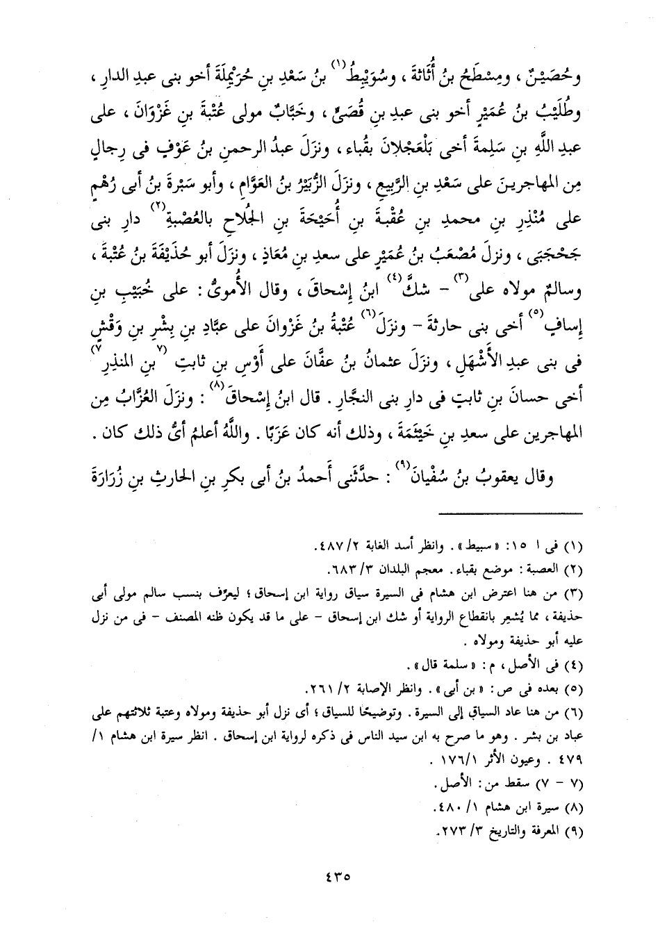 وَحُصَيْنٌ وَمِسْطَحُ بْنُ أُثَاثَةَ وَسُويْبِطُ بْنُ سَعْدِ بْنِ حُرَيْمِلَةَ أَخُو بَنِي عَبْدِ الدَّارِ، وَطُلَيْبُ بْنُ عُمَيْرٍ أَخُو بَنِي عَبْدِ بْنِ قُصَيٍّ، وَخَبَّابٌ مَوْلَى عُتْبَةَ بْنِ غَزَوَانَ عَلَى عَبْدِ اللَّهِ بْنِ سَلَمَةَ أَخِي بَلْعَجْلَانَ بِقُبَاءَ، وَنَزَلَ عَبْدُ الرَّحْمَنِ بْنُ عَوْفٍ فِي رِجَالٍ مِنَ الْمُهَاجِرِينَ عَلَى سَعْدِ بْنِ الرَّبِيعِ، وَنَزَلَ الزُّبَيْرُ بْنُ الْعَوَّامِ، وَأَبُو سَبْرَةَ بْنُ أَبِي رُهْمٍ عَلَى مُنْذِرِ بْنِ مُحَمَّدِ بْنِ عُقْبَةَ بْنِ أُحَيْحَةَ بْنِ الْجُلَاحِ بِالْعُصْبَةِ دَارِ بَنِي جَحْجَبَى، وَنَزَلَ مُصْعَبُ بْنُ عُمَيْرٍ عَلَى سَعْدِ بْنِ مُعَاذٍ، وَنَزَلَ أَبُو حُذَيْفَةَ بْنُ عُتْبَةَ، وَسَالِمٌ مَوْلَاهُ عَلَى - شَكَّ ابْنُ إِسْحَاقَ وَقَالَ الْأُمَوِيُّ: عَلَى خُبَيْبِ بْنِ إِسَافٍ أَخِي بَنِي حَارِثَةَ - وَنَزَلَ عُتْبَةُ بْنُ غَزْوَانَ عَلَى عَبَّادِ بْنِ بِشْرِ بْنِ وَقْشٍ فِي بَنِي عَبْدِ الْأَشْهَلِ، وَنَزَلَ عُثْمَانُ بْنُ عَفَّانَ عَلَى أَوْسِ بْنِ ثَابِتِ بْنِ الْمُنْذِرِ أَخِي حَسَّانَ بْنِ ثَابِتٍ فِي دَارِ بَنِي النَّجَّارِ، قَالَ ابْنُ إِسْحَاقَ وَنَزَلَ الْعُزَّابُ مِنَ الْمُهَاجِرِينَ عَلَى سَعْدِ بْنِ خَيْثَمَةَ، وَذَلِكَ أَنَّهُ كَانَ عَزَبًا. وَاللَّهُ أَعْلَمُ أَيُّ ذَلِكَ كَانَ.