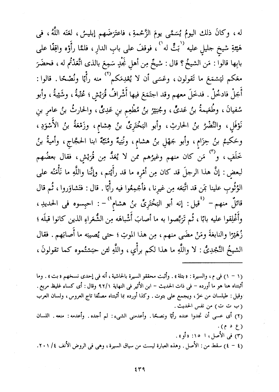 لَهُ، وَكَانَ ذَلِكَ الْيَوْمُ يُسَمَّى يَوْمَ الزَّحْمَةِ، فَاعْتَرَضَهُمْ إِبْلِيسُ، لَعَنَهُ اللَّهُ، فِي هَيْئَةِ شَيْخٍ جَلِيلٍ عَلَيْهِ بَتٌّ لَهُ، فَوَقَفَ عَلَى بَابِ الدَّارِ، فَلَمَّا رَأَوْهُ وَاقِفًا عَلَى بَابِهَا، قَالُوا: مَنِ الشَّيْخُ؟ قَالَ: شَيْخٌ مِنْ أَهْلِ نَجْدٍ سَمِعَ بِالَّذِي اتَّعَدْتُمْ لَهُ، فَحَضَرَ مَعَكُمْ; لِيَسْمَعَ مَا تَقُولُونَ، وَعَسَى أَنْ لَا يُعْدِمَكُمْ مِنْهُ رَأْيًا وَنُصْحًا. قَالُوا: أَجَلْ فَادْخُلْ. فَدَخَلَ مَعَهُمْ وَقَدِ اجْتَمَعَ فِيهَا أَشْرَافُ قُرَيْشٍ; عُتْبَةُ، وَشَيْبَةُ، وَأَبُو سُفْيَانَ، وَطُعَيْمَةُ بْنُ عَدِيٍّ، وَجُبَيْرُ بْنُ مُطْعِمِ بْنِ عَدِيٍّ، وَالْحَارِثُ بْنُ عَامِرِ بْنِ نَوْفَلٍ، وَالنَّضْرُ بْنُ الْحَارِثِ، وَأَبُو الْبَخْتَرِيِّ بْنُ هِشَامٍ، وَزَمْعَةُ بْنُ الْأَسْوَدِ، وَحَكِيمُ بْنُ حِزَامٍ، وَأَبُو جَهْلِ بْنُ هِشَامٍ، وَنُبَيْهٌ وَمُنَبِّهٌ ابْنَا الْحَجَّاجِ وَأُمَيَّةُ بْنُ خَلَفٍ، وَمَنْ كَانَ مِنْهُمْ وَغَيْرُهُمْ مِمَّنْ لَا يُعَدُّ مِنْ قُرَيْشٍ. فَقَالَ بَعْضُهُمْ لِبَعْضٍ: إِنَّ هَذَا الرَّجُلَ قَدْ كَانَ مِنْ أَمْرِهِ مَا قَدْ رَأَيْتُمْ، وَإِنَّنَا وَاللَّهِ مَا نَأْمَنُهُ عَلَى الْوُثُوبِ عَلَيْنَا بِمَنْ قَدِ اتَّبَعَهُ مِنْ غَيْرِنَا، فَأَجْمِعُوا فِيهِ رَأْيًا. قَالَ: فَتَشَاوَرُوا، ثُمَّ قَالَ قَائِلٌ مِنْهُمْ - قِيلَ: إِنَّهُ أَبُو الْبَخْتَرِيِّ بْنُ هِشَامٍ - احْبِسُوهُ فِي الْحَدِيدِ، وَأَغْلِقُوا عَلَيْهِ بَابًا، ثُمَّ تَرَبَّصُوا بِهِ مَا أَصَابَ أَشْبَاهَهُ مِنَ الشُّعَرَاءِ الَّذِينَ كَانُوا قَبْلَهُ; زُهَيْرًا وَالنَّابِغَةَ وَمَنْ مَضَى مِنْهُمْ، مِنْ هَذَا الْمَوْتِ; حَتَّى يُصِيبَهُ مَا أَصَابَهُمْ. فَقَالَ الشَّيْخُ النَّجْدِيُّ: لَا وَاللَّهِ مَا هَذَا لَكُمْ بِرَأْيٍ، وَاللَّهِ لَئِنْ حَبَسْتُمُوهُ كَمَا تَقُولُونَ،
