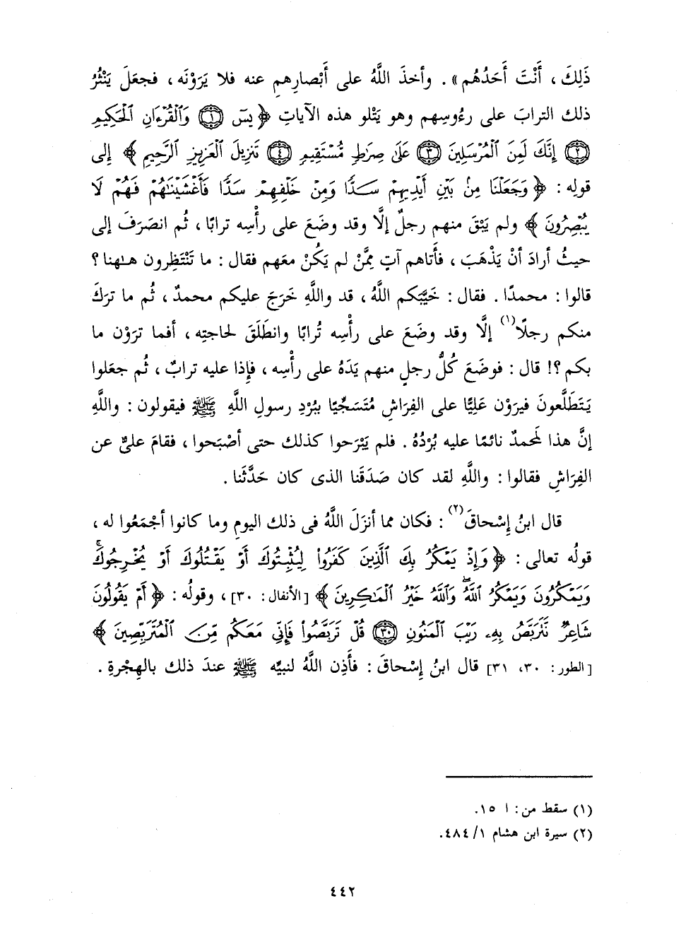 ذَلِكَ، أَنْتَ أَحَدُهُمْ ". وَأَخَذَ اللَّهُ عَلَى أَبْصَارِهِمْ عَنْهُ فَلَا يَرَوْنَهُ، فَجَعَلَ يَنْثُرُ ذَلِكَ التُّرَابَ عَلَى رُؤُوسِهِمْ وَهُوَ يَتْلُو هَذِهِ الْآيَاتِ {يس وَالْقُرْآنِ الْحَكِيمِ إِنَّكَ لَمِنَ الْمُرْسَلِينَ عَلَى صِرَاطٍ مُسْتَقِيمٍ تَنْزِيلَ الْعَزِيزِ الرَّحِيمِ} [يس: 1] إِلَى قَوْلِهِ {وَجَعَلْنَا مِنْ بَيْنِ أَيْدِيهِمْ سَدًّا وَمِنْ خَلْفِهِمْ سَدًّا فَأَغْشَيْنَاهُمْ فَهُمْ لَا يُبْصِرُونَ} [يس: 9] . وَلَمْ يَبْقَ مِنْهُمْ رَجُلٌ إِلَّا وَقَدْ وَضَعَ عَلَى رَأْسِهِ تُرَابًا، ثُمَّ انْصَرَفَ إِلَى حَيْثُ أَرَادَ أَنْ يَذْهَبَ، فَأَتَاهُمْ آتٍ مِمَّنْ لَمْ يَكُنْ مَعَهُمْ، فَقَالَ: مَا تَنْتَظِرُونَ هَاهُنَا؟ قَالُوا: مُحَمَّدًا. فَقَالَ: خَيَّبَكُمُ اللَّهُ، قَدْ وَاللَّهِ خَرَجَ عَلَيْكُمْ مُحَمَّدٌ، ثُمَّ مَا تَرَكَ مِنْكُمْ رَجُلًا إِلَّا وَقَدْ وَضَعَ عَلَى رَأْسِهِ تُرَابًا، وَانْطَلَقَ لِحَاجَتِهِ، أَفَمَا تَرَوْنَ مَا بِكُمْ؟ قَالَ: فَوَضَعَ كُلُّ رَجُلٍ مِنْهُمْ يَدَهُ عَلَى رَأْسِهِ فَإِذَا عَلَيْهِ تُرَابٌ، ثُمَّ جَعَلُوا يَتَطَلَّعُونَ، فَيَرَوْنَ عَلِيًّا عَلَى الْفِرَاشِ مُتَسَجِّيًا بِبُرْدِ رَسُولِ اللَّهِ صَلَّى اللَّهُ عَلَيْهِ وَسَلَّمَ، فَيَقُولُونَ: وَاللَّهِ إِنَّ هَذَا لَمُحَمَّدٌ نَائِمًا عَلَيْهِ بُرْدُهُ. فَلَمْ يَبْرَحُوا كَذَلِكَ حَتَّى أَصْبَحُوا، فَقَامَ عَلِيٌّ عَنِ الْفِرَاشِ فَقَالُوا: وَاللَّهِ لَقَدْ كَانَ صَدَقَنَا الَّذِي كَانَ حَدَّثَنَا.»