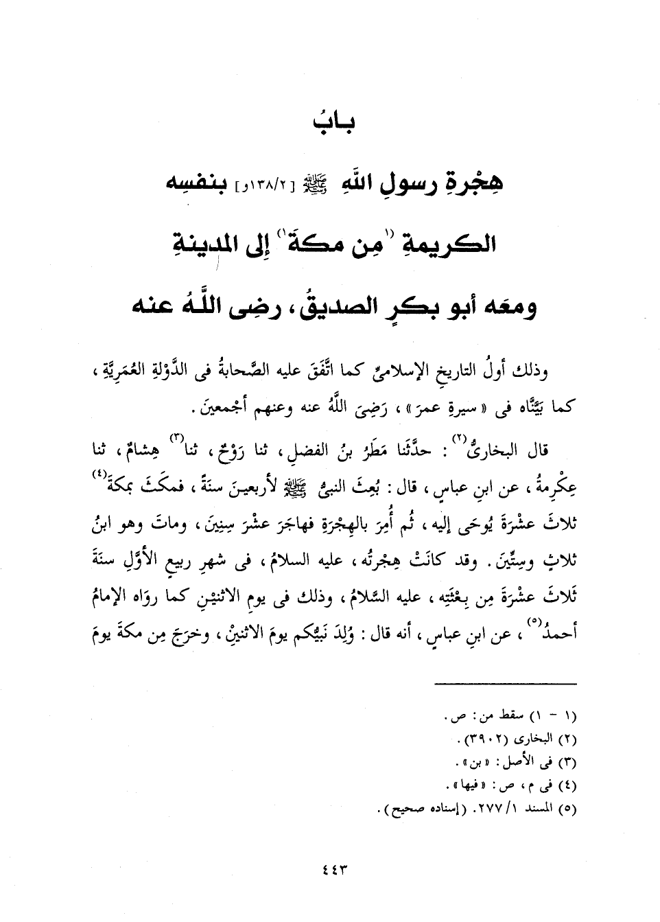 قَالَ الْبُخَارِيُّ: حَدَّثَنَا مَطَرُ بْنُ الْفَضْلِ، ثَنَا رَوْحٌ، ثَنَا هِشَامٌ، ثَنَا عِكْرِمَةُ، عَنِ ابْنِ عَبَّاسٍ، قَالَ: «بُعِثَ النَّبِيُّ صَلَّى اللَّهُ عَلَيْهِ وَسَلَّمَ لِأَرْبَعِينَ سَنَةً، فَمَكَثَ بِمَكَّةَ ثَلَاثَ عَشْرَةَ يُوحَى إِلَيْهِ، ثُمَّ أُمِرَ بِالْهِجْرَةِ فَهَاجَرَ عَشْرَ سِنِينَ، وَمَاتَ وَهُوَ ابْنُ ثَلَاثٍ وَسِتِّينَ. وَقَدْ كَانَتْ هِجْرَتُهُ، عَلَيْهِ السَّلَامُ، فِي شَهْرِ رَبِيعٍ الْأَوَّلِ سَنَةَ ثَلَاثَ عَشْرَةَ مِنْ بِعْثَتِهِ عَلَيْهِ السَّلَامُ، وَذَلِكَ فِي يَوْمِ الِاثْنَيْنِ» كَمَّا رَوَاهُ الْإِمَامُ أَحْمَدُ، عَنِ ابْنِ عَبَّاسٍ، أَنَّهُ قَالَ: «وُلِدَ نَبِيُّكُمْ يَوْمَ الِاثْنَيْنِ، وَخَرَجَ مِنْ مَكَّةَ يَوْمَ