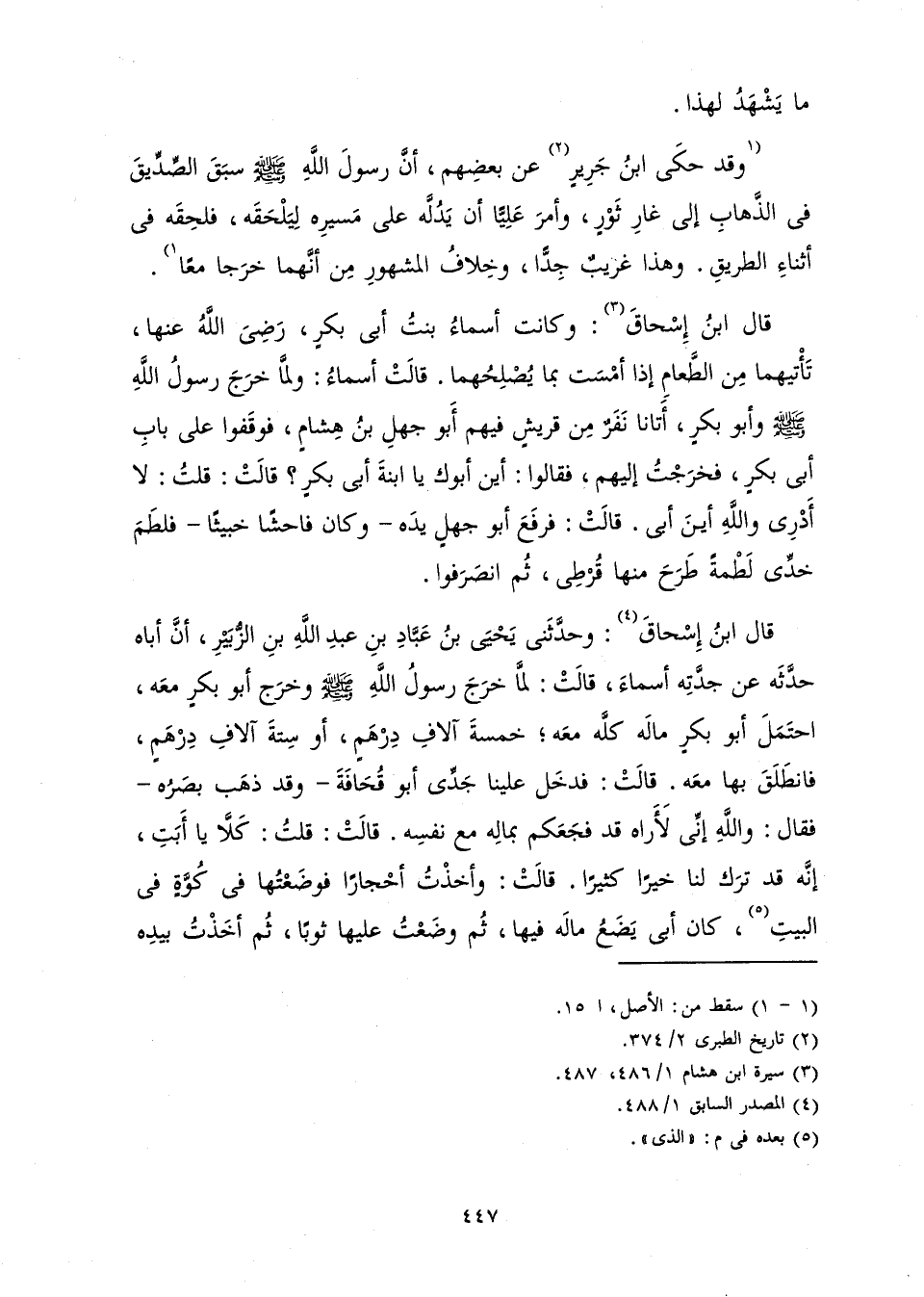 قَالَ ابْنُ إِسْحَاقَ: وَكَانَتْ أَسْمَاءُ بِنْتُ أَبِي بَكْرٍ رَضِيَ اللَّهُ عَنْهَا تَأْتِيهِمَا مِنَ الطَّعَامِ إِذَا أَمْسَتْ بِمَا يُصْلِحُهُمَا. قَالَتْ أَسْمَاءُ: وَلَمَّا خَرَجَ رَسُولُ اللَّهِ صَلَّى اللَّهُ عَلَيْهِ وَسَلَّمَ وَأَبُو بَكْرٍ أَتَانَا نَفَرٌ مِنْ قُرَيْشٍ فِيهِمْ أَبُو جَهْلِ بْنُ هِشَامٍ، فَوَقَفُوا عَلَى بَابِ أَبِي بَكْرٍ، فَخَرَجْتُ إِلَيْهِمْ، فَقَالُوا: أَيْنَ أَبُوكِ يَا ابْنَةَ أَبِي بَكْرٍ؟ قَالَتْ: قُلْتُ: لَا أَدْرِي وَاللَّهِ أَيْنَ أَبِي؟ قَالَتْ: فَرَفَعَ أَبُو جَهْلٍ يَدَهُ - وَكَانَ فَاحِشًا خَبِيثًا - فَلَطَمَ خَدِّي لَطْمَةً طَرَحَ مِنْهَا قُرْطِي، ثُمَّ انْصَرَفُوا.