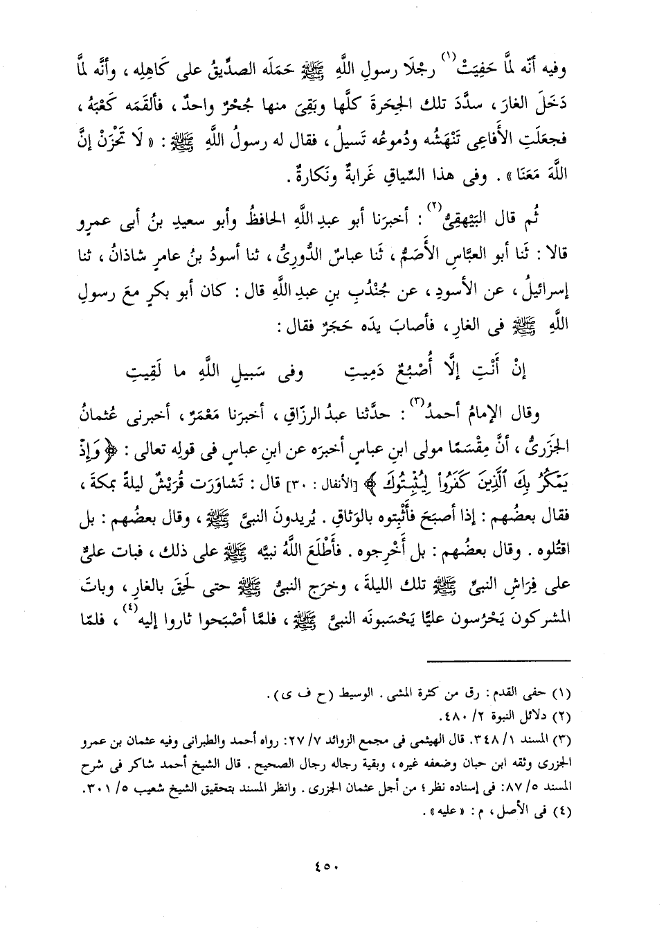 وَفِيهِ أَنَّهُ «لَمَّا حَفِيَتْ رِجْلَا رَسُولِ اللَّهِ صَلَّى اللَّهُ عَلَيْهِ وَسَلَّمَ حَمَلَهُ الصِّدِّيقُ عَلَى كَاهِلِهِ، وَأَنَّهُ لَمَّا دَخَلَ الْغَارَ سَدَّدَ تِلْكَ الْجِحَرَةَ كُلَّهَا، وَبَقِيَ مِنْهَا جُحْرٌ وَاحِدٌ، فَأَلْقَمَهُ كَعْبَهُ، فَجَعَلَتِ الْأَفَاعِي تَنْهَشُهُ وَدُمُوعُهُ تَسِيلُ، فَقَالَ لَهُ رَسُولُ اللَّهِ صَلَّى اللَّهُ عَلَيْهِ وَسَلَّمَ: " لَا تَحْزَنْ إِنَّ اللَّهَ مَعَنَا ".» وَفِي هَذَا السِّيَاقِ غَرَابَةٌ وَنَكَارَةٌ.