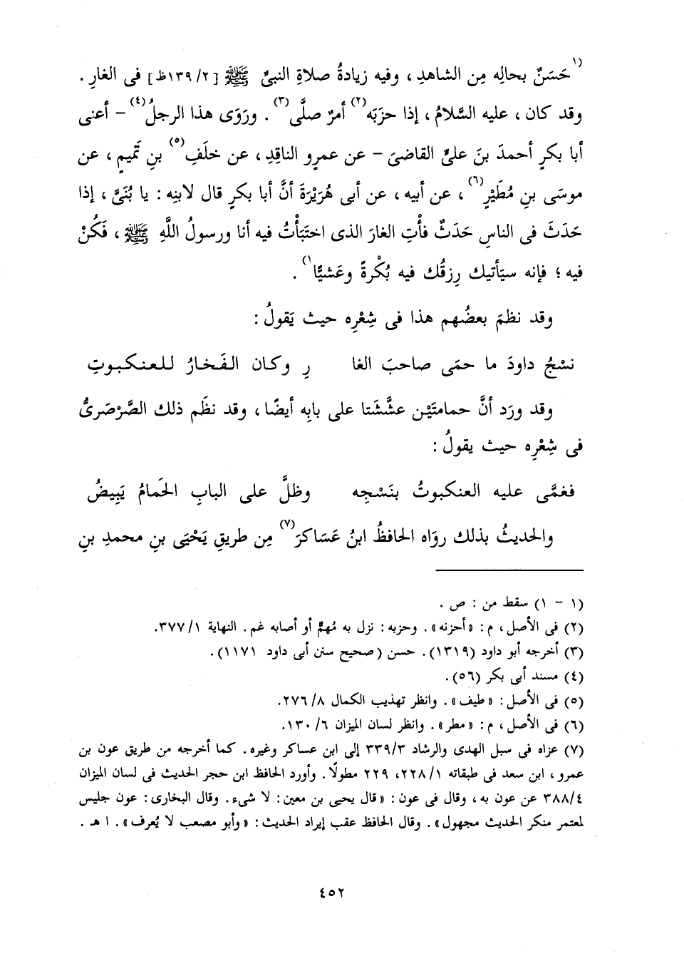 حَسَنٌ بِحَالِهِ مِنَ الشَّاهِدِ. وَفِيهِ زِيَادَةُ صَلَاةِ النَّبِيِّ صَلَّى اللَّهُ عَلَيْهِ وَسَلَّمَ فِي الْغَارِ، وَقَدْ كَانَ، عَلَيْهِ السَّلَامُ، إِذَا حَزَبَهُ أَمْرٌ صَلَّى. وَرَوَى هَذَا الرَّجُلُ - أَعْنِي أَبَا بَكْرٍ أَحْمَدَ بْنَ عَلِيٍّ الْقَاضِيَ - عَنْ عَمْرٍو النَّاقِدِ، عَنْ خَلَفِ بْنِ تَمِيمٍ، عَنْ مُوسَى بْنِ مُطَيْرٍ، عَنْ أَبِيهِ، عَنْ أَبِي هُرَيْرَةَ، «أَنَّ أَبَا بَكْرٍ قَالَ لِابْنِهِ: يَا بُنَيَّ، إِذَا حَدَثَ فِي النَّاسِ حَدَثٌ، فَأْتِ الْغَارَ الَّذِي اخْتَبَأَتُ فِيهِ أَنَا وَرَسُولُ اللَّهِ صَلَّى اللَّهُ عَلَيْهِ وَسَلَّمَ، فَكُنْ فِيهِ; فَإِنَّهُ سَيَأْتِيكَ رِزْقُكَ فِيهِ بُكْرَةً وَعَشِيًّا.» وَقَدْ نَظَمَ بَعْضُهُمْ هَذَا فِي شِعْرِهِ حَيْثُ يَقُولُ: