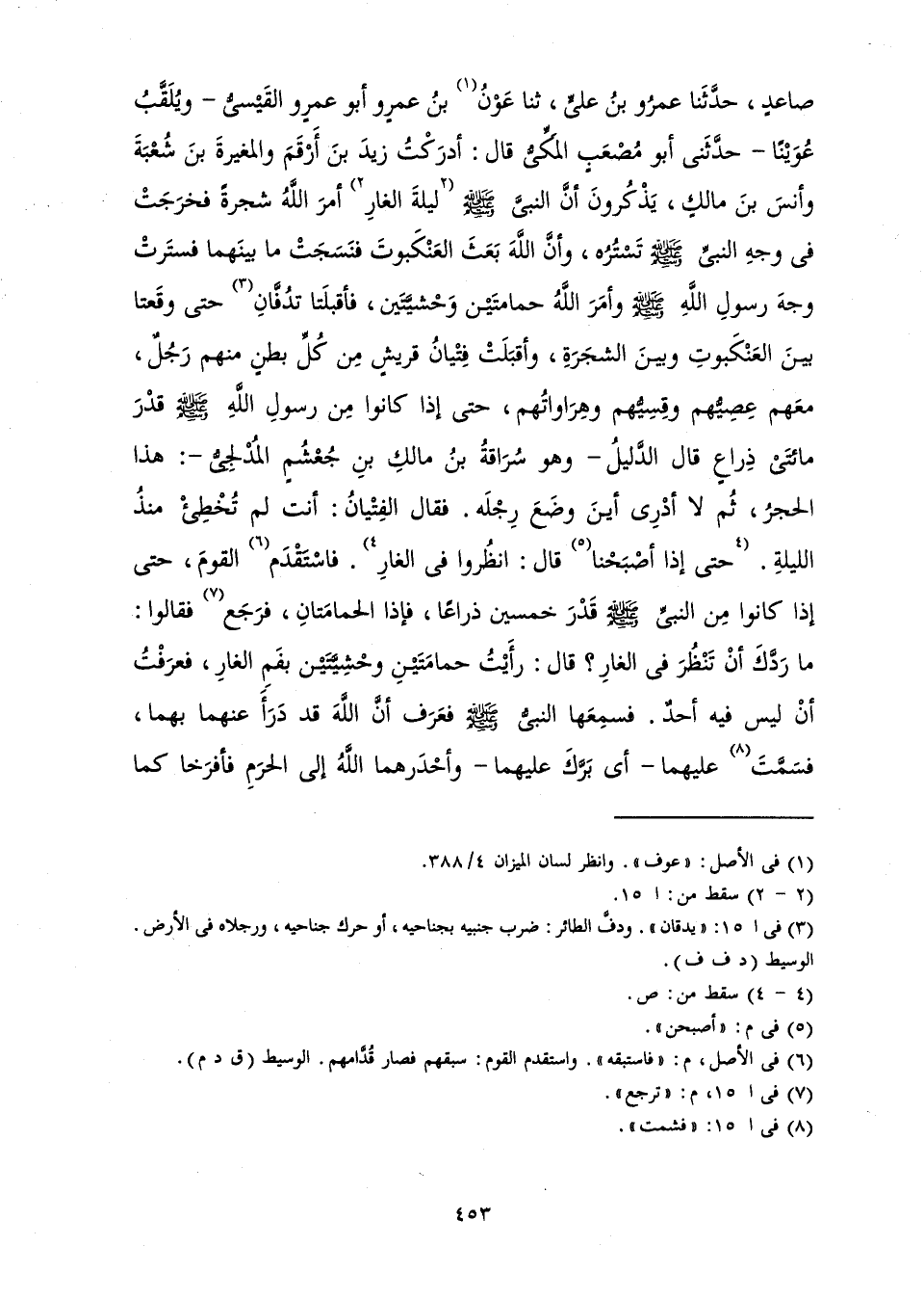 صَاعِدٍ، حَدَّثَنَا عَمْرُو بْنُ عَلِيٍّ، ثَنَا عَوْنُ بْنُ عَمْرٍو أَبُو عَمْرٍو الْقَيْسِيُّ - وَيُلَقَّبُ عُوَيْنًا - حَدَّثَنِي أَبُو مُصْعَبٍ الْمَكِّيُّ، قَالَ: «أَدْرَكْتُ زَيْدَ بْنَ أَرْقَمَ، وَالْمُغِيرَةَ بْنَ شُعْبَةَ، وَأَنَسَ بْنَ مَالِكٍ، يَذْكُرُونَ أَنَّ النَّبِيَّ صَلَّى اللَّهُ عَلَيْهِ وَسَلَّمَ لَيْلَةَ الْغَارِ أَمَرَ اللَّهُ شَجَرَةً فَخَرَجَتْ فِي وَجْهِ النَّبِيِّ صَلَّى اللَّهُ عَلَيْهِ وَسَلَّمَ تَسْتُرُهُ، وَأَنَّ اللَّهَ بَعَثَ الْعَنْكَبُوتَ فَنَسَجَتْ مَا بَيْنَهُمَا فَسَتَرَتْ وَجْهَ رَسُولِ اللَّهِ صَلَّى اللَّهُ عَلَيْهِ وَسَلَّمَ، وَأَمَرَ اللَّهُ حَمَامَتَيْنِ وَحْشِيَّتَيْنِ، فَأَقْبَلَتَا تَدُفَّانِ حَتَّى وَقَعَتَا بَيْنَ الْعَنْكَبُوتِ وَبَيْنَ الشَّجَرَةِ، وَأَقْبَلَتْ فِتْيَانُ قُرَيْشٍ مِنْ كُلِّ بَطْنٍ مِنْهُمْ رَجُلٌ، مَعَهُمْ عِصِيُّهُمْ وَقِسِيُّهُمْ وَهِرَاوَاتُهُمْ، حَتَّى إِذَا كَانُوا مِنْ رَسُولِ اللَّهِ صَلَّى اللَّهُ عَلَيْهِ وَسَلَّمَ قَدْرَ مِائَتَيْ ذِرَاعٍ، قَالَ الدَّلِيلُ - وَهُوَ سُرَاقَةُ بْنُ مَالِكٍ بْنِ جُعْشُمٍ الْمُدْلِجِيُّ - هَذَا الْحَجَرُ، ثُمَّ لَا أَدْرِي أَيْنَ وَضَعَ رِجْلَهُ. فَقَالَ الْفِتْيَانُ: أَنْتَ لَمْ تُخْطِئْ مُنْذُ اللَّيْلَةِ. حَتَّى إِذَا أَصْبَحْنَا قَالَ: انْظُرُوا فِي الْغَارِ. فَاسْتَقْدَمَ الْقَوْمَ حَتَّى إِذَا كَانُوا مِنَ النَّبِيِّ صَلَّى اللَّهُ عَلَيْهِ وَسَلَّمَ قَدْرَ خَمْسِينَ ذِرَاعًا، فَإِذَا الْحَمَامَتَانِ، فَرَجَعَ فَقَالُوا: مَا رَدَّكَ أَنْ تَنْظُرَ فِي الْغَارِ؟ قَالَ: رَأَيْتُ حَمَامَتَيْنِ وَحْشِيَّتَيْنِ بِفَمِ الْغَارِ، فَعَرَفَتْ أَنْ لَيْسَ فِيهِ أَحَدٌ. فَسَمِعَهَا النَّبِيُّ صَلَّى اللَّهُ عَلَيْهِ وَسَلَّمَ فَعَرَفَ أَنَّ اللَّهَ قَدْ دَرَأَ عَنْهُمَا بِهِمَا، فَسَمَّتَ عَلَيْهِمَا - أَيْ بَرَّكَ عَلَيْهِمَا - وَأَحْدَرَهُمَا اللَّهُ إِلَى الْحَرَمِ فَأَفْرَخَا كَمَا