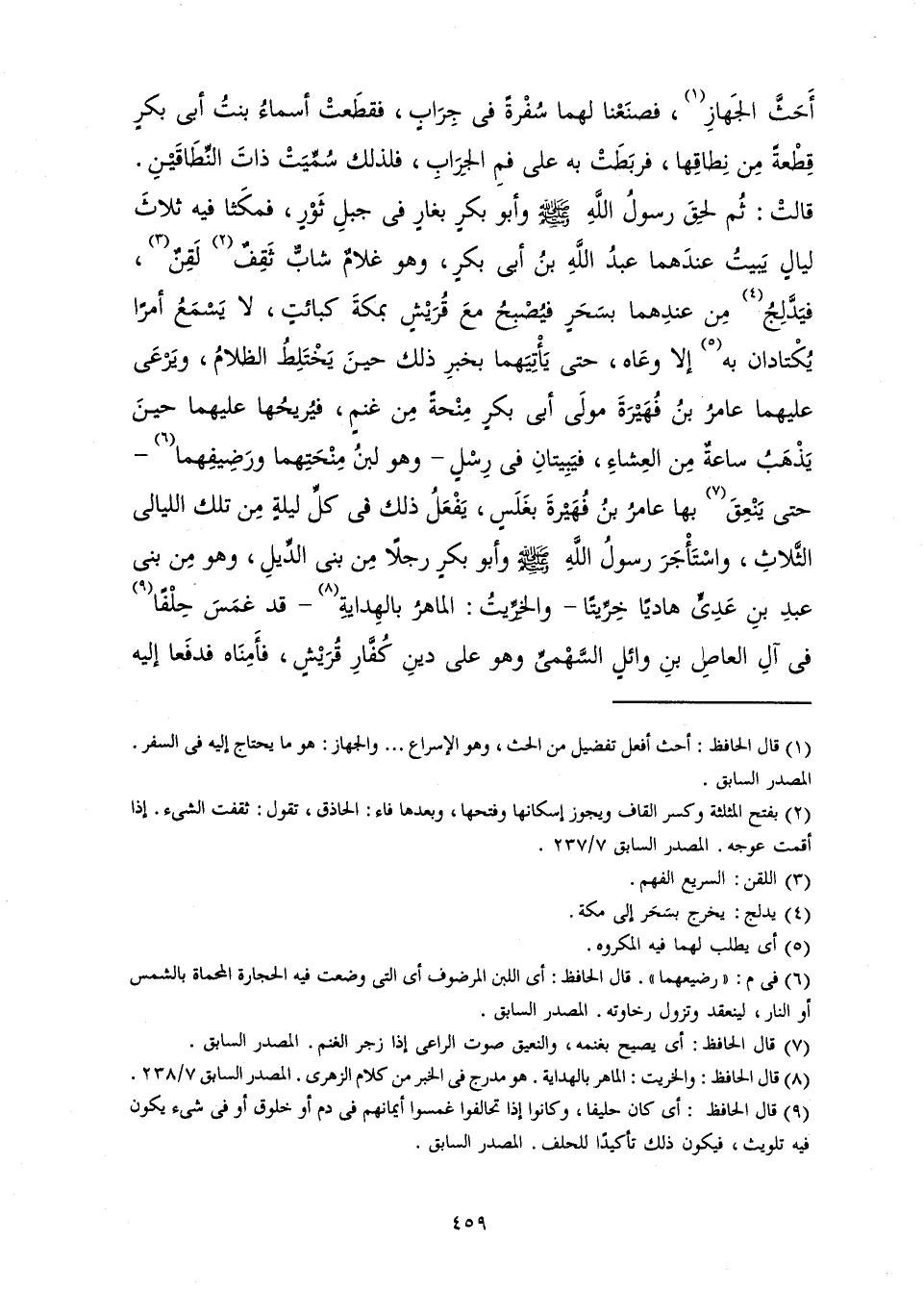 أَحَثَّ الْجَهَازِ، فَصَنَعْنَا لَهُمَا سُفْرَةً فِي جِرَابٍ، فَقَطَعَتْ أَسْمَاءُ بِنْتُ أَبِي بَكْرٍ قِطْعَةً مِنْ نِطَاقِهَا، فَرَبَطَتْ بِهِ عَلَى فَمِ الْجِرَابِ، فَلِذَلِكَ سُمِّيَتْ ذَاتَ النِّطَاقَيْنِ. قَالَتْ: ثُمَّ لَحِقَ رَسُولُ اللَّهِ صَلَّى اللَّهُ عَلَيْهِ وَسَلَّمَ وَأَبُو بَكْرٍ بِغَارٍ فِي جَبَلِ ثَوْرٍ، فَمَكَثَا فِيهِ ثَلَاثَ لَيَالٍ، يَبِيتُ عِنْدَهُمَا عَبْدُ اللَّهِ بْنُ أَبِي بَكْرٍ، وَهُوَ غُلَامٌ شَابٌّ ثَقِفٌ لَقِنٌ، فَيَدْلِجُ مِنْ عِنْدِهِمَا بِسَحَرٍ، فَيُصْبِحُ مَعَ قُرَيْشٍ بِمَكَّةَ كَبَائِتٍ، لَا يَسْمَعُ أَمْرًا يُكْتَادَانِ بِهِ إِلَّا وَعَاهُ، حَتَّى يَأْتِيَهُمَا بِخَبَرِ ذَلِكَ حِينَ يَخْتَلِطُ الظَّلَامُ، وَيَرْعَى عَلَيْهِمَا عَامِرُ بْنُ فُهَيْرَةَ مَوْلَى أَبِي بَكْرٍ مِنْحَةً مِنْ غَنَمٍ، فَيُرِيحُهَا عَلَيْهِمَا حِينَ يَذْهَبُ سَاعَةٌ مِنَ الْعَشَاءِ فَيَبِيتَانِ فِي رِسْلٍ - وَهُوَ لَبَنُ مِنْحَتِهِمَا وَرَضِيفِهِمَا - حَتَّى يَنْعِقَ بِهَا عَامِرُ بْنُ فُهَيْرَةَ بِغَلَسٍ، يَفْعَلُ ذَلِكَ فِي كُلِّ لَيْلَةٍ مِنْ تِلْكَ اللَّيَالِي الثَّلَاثِ، وَاسْتَأْجَرَ رَسُولُ اللَّهِ صَلَّى اللَّهُ عَلَيْهِ وَسَلَّمَ وَأَبُو بَكْرٍ رَجُلًا مِنْ بَنِي الدِّيلِ، وَهُوَ مِنْ بَنِي عَبْدِ بْنِ عَدِيٍّ هَادِيًا خِرِّيتًا - وَالْخِرِّيتُ: الْمَاهِرُ بِالْهِدَايَةِ - قَدْ غَمَسَ حِلْفًا فِي آلِ الْعَاصِ بْنِ وَائِلٍ السَّهْمِيِّ، وَهُوَ عَلَى دِينِ كُفَّارِ قُرَيْشٍ، فَأَمِنَاهُ فَدَفَعَا إِلَيْهِ