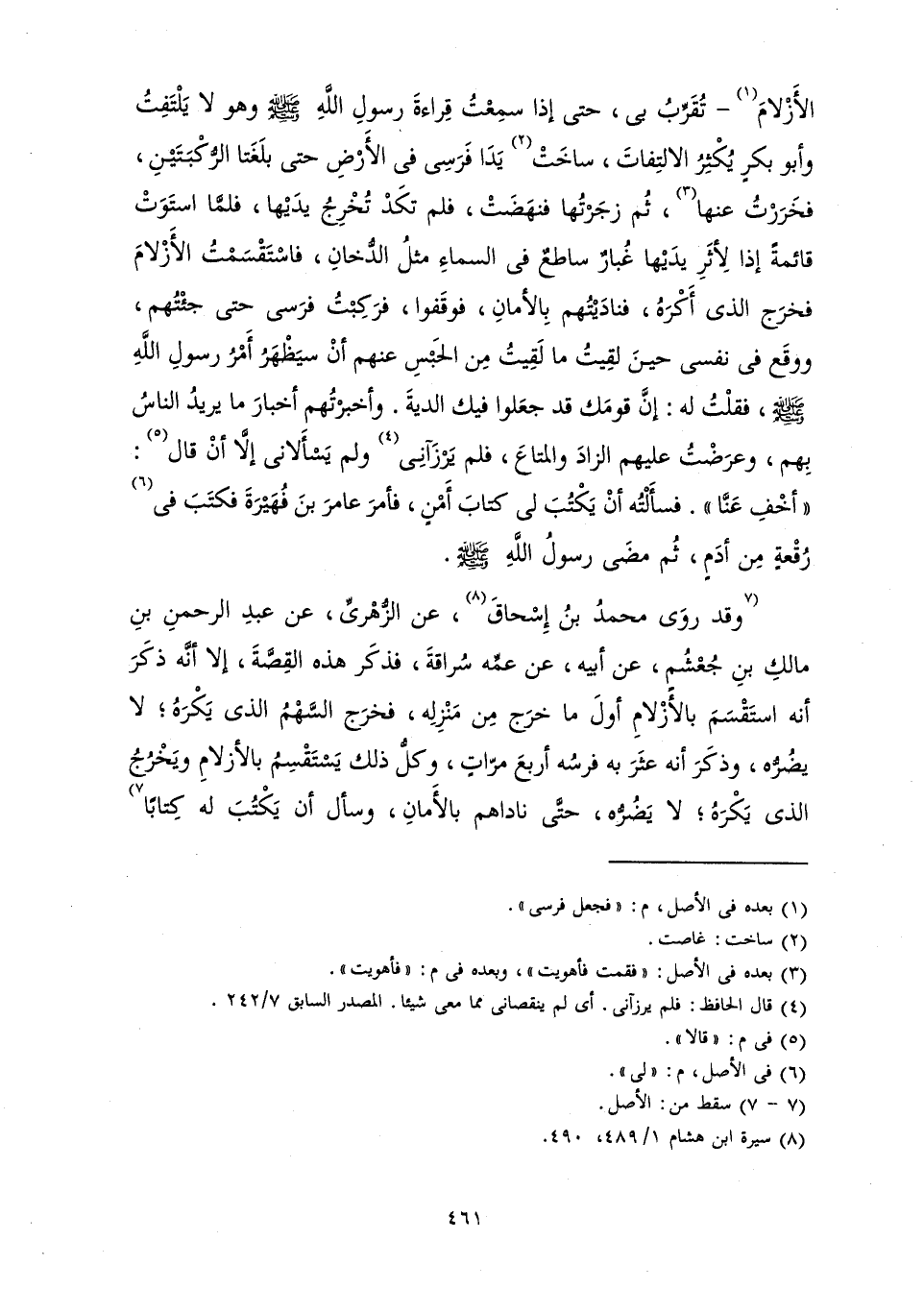 الْأَزْلَامَ - تُقَرِّبُ بِي، حَتَّى إِذَا سَمِعْتُ قِرَاءَةَ رَسُولِ اللَّهِ صَلَّى اللَّهُ عَلَيْهِ وَسَلَّمَ، وَهُوَ لَا يَلْتَفِتُ وَأَبُو بَكْرٍ يُكْثِرُ الِالْتِفَاتَ، سَاخَتْ يَدَا فَرَسِي فِي الْأَرْضِ حَتَّى بَلَغَتَا الرُّكْبَتَيْنِ، فَخَرَرْتُ عَنْهَا، ثُمَّ زَجَرْتُهَا فَنَهَضَتْ، فَلَمْ تَكَدْ تُخْرِجُ يَدَيْهَا، فَلَمَّا اسْتَوَتْ قَائِمَةً إِذَا لِأَثَرِ يَدَيْهَا غُبَارٌ سَاطِعٌ فِي السَّمَاءِ مِثْلُ الدُّخَّانِ، فَاسْتَقْسَمَتُ الْأَزْلَامَ فَخَرَجَ الَّذِي أَكْرَهُ، فَنَادَيْتُهُمْ بِالْأَمَانِ، فَوَقَفُوا فَرَكِبْتُ فَرَسِي حَتَّى جِئْتُهُمْ، وَوَقَعَ فِي نَفْسِي حِينَ لَقِيتُ مَا لَقِيتُ مِنَ الْحَبْسِ عَنْهُمْ أَنْ سَيَظْهَرُ أَمْرُ رَسُولِ اللَّهِ صَلَّى اللَّهُ عَلَيْهِ وَسَلَّمَ، فَقُلْتُ لَهُ: إِنْ قَوْمَكَ قَدْ جَعَلُوا فِيكَ الدِّيَةَ. وَأَخْبَرْتُهُمْ أَخْبَارَ مَا يُرِيدُ النَّاسُ بِهِمْ، وَعَرَضْتُ عَلَيْهِمُ الزَّادَ وَالْمَتَاعَ، فَلَمْ يَرْزَآنِي وَلَمْ يَسْأَلَانِي إِلَّا أَنْ قَالَ: " أَخْفِ عَنَّا ". فَسَأَلْتُهُ أَنْ يَكْتُبَ لِي كِتَابَ أَمْنٍ، فَأَمَرَ عَامِرَ بْنَ فُهَيْرَةَ فَكَتَبَ فِي رُقْعَةٍ مَنْ أَدَمٍ، ثُمَّ مَضَى رَسُولُ اللَّهِ صَلَّى اللَّهُ عَلَيْهِ وَسَلَّمَ.»