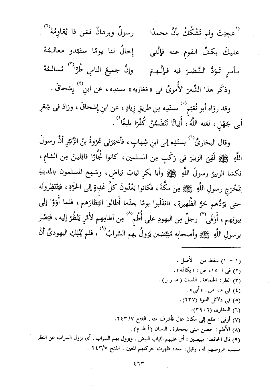 وَذَكَرَ هَذَا الشِّعْرَ الْأُمَوِيُّ فِي " مَغَازِيهِ " بِسَنَدِهِ عَنِ ابْنِ إِسْحَاقَ