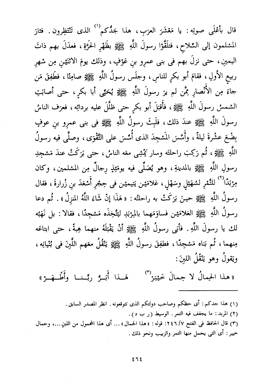 قَالَ بِأَعْلَى صَوْتِهِ: يَا مَعْشَرَ الْعَرَبِ، هَذَا جَدُّكُمُ الَّذِي تَنْتَظِرُونَ. فَثَارَ الْمُسْلِمُونَ إِلَى السِّلَاحِ فَتَلَقَّوْا رَسُولَ اللَّهِ صَلَّى اللَّهُ عَلَيْهِ وَسَلَّمَ بِظَهْرِ الْحَرَّةِ، فَعَدَلَ بِهِمْ ذَاتَ الْيَمِينِ، حَتَّى نَزَلَ بِهِمْ فِي بَنِي عَمْرِو بْنِ عَوْفٍ، وَذَلِكَ يَوْمَ الِاثْنَيْنِ مِنْ شَهْرِ رَبِيعٍ الْأَوَّلِ، فَقَامَ أَبُو بَكْرٍ لِلنَّاسِ وَجَلَسَ رَسُولُ اللَّهِ صَلَّى اللَّهُ عَلَيْهِ وَسَلَّمَ صَامِتًا، فَطَفِقَ مَنْ جَاءَ مِنَ الْأَنْصَارِ مِمَّنْ لَمْ يَرَ رَسُولَ اللَّهِ صَلَّى اللَّهُ عَلَيْهِ وَسَلَّمَ يُحَيِّي أَبَا بَكْرٍ، حَتَّى أَصَابَتِ الشَّمْسُ رَسُولَ اللَّهِ صَلَّى اللَّهُ عَلَيْهِ وَسَلَّمَ، فَأَقْبَلَ أَبُو بَكْرٍ حَتَّى ظَلَّلَ عَلَيْهِ بِرِدَائِهِ، فَعَرَفَ النَّاسُ رَسُولَ اللَّهِ صَلَّى اللَّهُ عَلَيْهِ وَسَلَّمَ عِنْدَ ذَلِكَ، فَلَبِثَ رَسُولُ اللَّهِ صَلَّى اللَّهُ عَلَيْهِ وَسَلَّمَ فِي بَنِي عَمْرِو بْنِ عَوْفٍ بِضْعَ عَشْرَةَ لَيْلَةً، وَأَسَّسَ الْمَسْجِدَ الَّذِي أُسِّسَ عَلَى التَّقْوَى، وَصَلَّى فِيهِ رَسُولُ اللَّهِ صَلَّى اللَّهُ عَلَيْهِ وَسَلَّمَ، ثُمَّ رَكِبَ رَاحِلَتَهُ، وَسَارَ يَمْشِي مَعَهُ النَّاسُ، حَتَّى بَرَكَتْ عِنْدَ مَسْجِدِ رَسُولِ اللَّهِ صَلَّى اللَّهُ عَلَيْهِ وَسَلَّمَ بِالْمَدِينَةِ، وَهُوَ يُصَلِّي فِيهِ يَوْمَئِذٍ رِجَالٌ مِنَ الْمُسْلِمِينَ، وَكَانَ مِرْبَدًا لِلتَّمْرِ لِسُهَيْلٍ وَسَهْلٍ غُلَامَيْنِ يَتِيمَيْنِ فِي حِجْرِ أَسْعَدَ بْنِ زُرَارَةَ، فَقَالَ رَسُولُ اللَّهِ صَلَّى اللَّهُ عَلَيْهِ وَسَلَّمَ حِينَ بَرَكَتْ بِهِ رَاحِلَتُهُ: " هَذَا إِنْ شَاءَ اللَّهُ الْمَنْزِلُ ". ثُمَّ دَعَا رَسُولُ اللَّهِ صَلَّى اللَّهُ عَلَيْهِ وَسَلَّمَ الْغُلَامَيْنِ فَسَاوَمَهُمَا بِالْمِرْبَدِ; لِيَتَّخِذَهُ مَسْجِدًا، فَقَالَا: بَلْ نَهَبُهُ لَكَ يَا رَسُولَ اللَّهِ. فَأَبَى رَسُولُ اللَّهِ صَلَّى اللَّهُ عَلَيْهِ وَسَلَّمَ أَنْ يَقْبَلَهُ مِنْهُمَا هِبَةً، حَتَّى ابْتَاعَهُ مِنْهُمَا، ثُمَّ بَنَاهُ مَسْجِدًا، فَطَفِقَ رَسُولُ اللَّهِ صَلَّى اللَّهُ عَلَيْهِ وَسَلَّمَ يَنْقُلُ مَعَهُمُ اللَّبِنَ فِي بُنْيَانِهِ، وَيَقُولُ وَهُوَ يَنْقُلُ اللَّبِنَ: