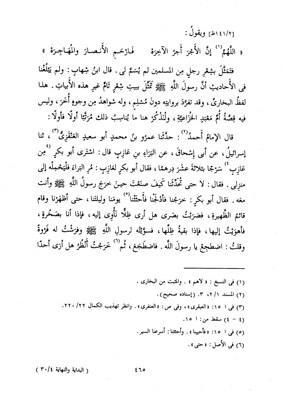 قَالَ الْإِمَامُ أَحْمَدُ: حَدَّثَنَا عَمْرُو بْنُ مُحَمَّدٍ أَبُو سَعِيدٍ الْعَنْقَزِيُّ، ثَنَا إِسْرَائِيلُ، عَنْ أَبِي إِسْحَاقَ، عَنِ الْبَرَاءِ بْنِ عَازِبٍ، قَالَ: «اشْتَرَى أَبُو بَكْرٍ مِنْ عَازِبٍ سَرْجًا بِثَلَاثَةَ عَشَرَ دِرْهَمًا، فَقَالَ أَبُو بَكْرٍ لِعَازِبٍ: مُرِ الْبَرَاءَ فَلْيَحْمِلْهُ إِلَى مَنْزِلِي. فَقَالَ: لَا حَتَّى تُحَدِّثَنَا كَيْفَ صَنَعْتَ حِينَ خَرَجَ رَسُولُ اللَّهِ صَلَّى اللَّهُ عَلَيْهِ وَسَلَّمَ وَأَنْتَ مَعَهُ. فَقَالَ أَبُو بَكْرٍ: خَرَجْنَا فَأَدْلَجْنَا فَأَحْثَثْنَا يَوْمَنَا وَلَيْلَتَنَا حَتَّى أَظْهَرْنَا، وَقَامَ قَائِمُ الظَّهِيرَةِ، فَضَرَبْتُ بَصَرِي هَلْ أَرَى ظِلًّا نَأْوِي إِلَيْهِ، فَإِذَا أَنَا بِصَخْرَةٍ، فَأَهْوَيْتُ إِلَيْهَا، فَإِذَا بَقِيَّةُ ظِلِّهَا، فَسَوَّيْتُهُ لِرَسُولِ اللَّهِ صَلَّى اللَّهُ عَلَيْهِ وَسَلَّمَ وَفَرَشْتُ لَهُ فَرْوَةً، وَقُلْتُ: اضْطَجِعْ يَا رَسُولَ اللَّهِ. فَاضْطَجَعَ، ثُمَّ خَرَجْتُ أَنْظُرُ هَلْ أَرَى أَحَدًا