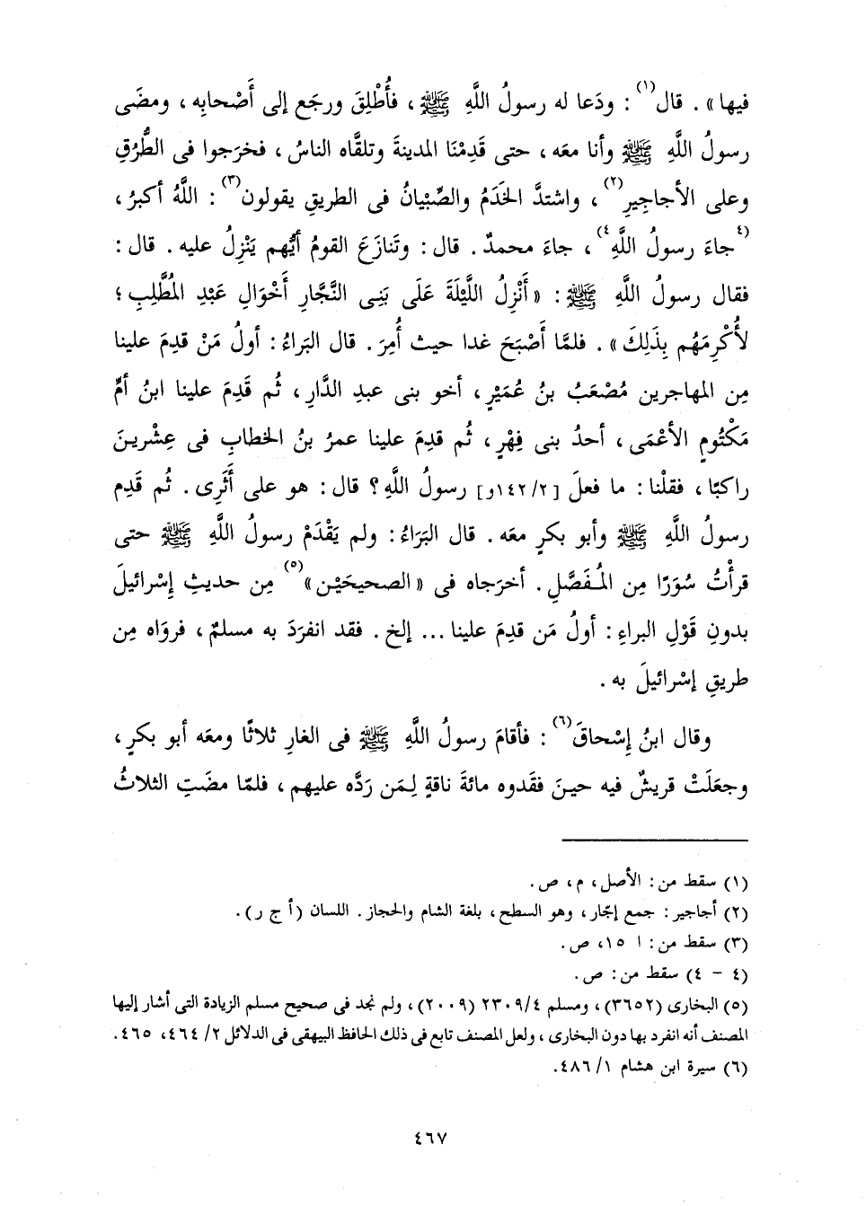 فِيهَا ". قَالَ: وَدَعَا لَهُ رَسُولُ اللَّهِ صَلَّى اللَّهُ عَلَيْهِ وَسَلَّمَ فَأُطْلِقَ وَرَجَعَ إِلَى أَصْحَابِهِ، وَمَضَى رَسُولُ اللَّهِ صَلَّى اللَّهُ عَلَيْهِ وَسَلَّمَ وَأَنَا مَعَهُ حَتَّى قَدِمْنَا الْمَدِينَةَ وَتَلَقَّاهُ النَّاسُ، فَخَرَجُوا فِي الطُّرُقِ وَعَلَى الْأَجَاجِيرِ، وَاشْتَدَّ الْخَدَمَ وَالصِّبْيَانَ فِي الطَّرِيقِ يَقُولُونَ: اللَّهُ أَكْبَرُ جَاءَ رَسُولَ اللَّهِ، جَاءَ مُحَمَّدٌ. قَالَ: وَتَنَازَعَ الْقَوْمُ أَيُّهُمْ يَنْزِلُ عَلَيْهِ. قَالَ: فَقَالَ رَسُولُ اللَّهِ صَلَّى اللَّهُ عَلَيْهِ وَسَلَّمَ: " أَنْزِلُ اللَّيْلَةَ عَلَى بَنِي النَّجَّارِ أَخْوَالِ عَبْدِ الْمُطَّلِبِ; لِأُكْرِمَهُمْ بِذَلِكَ ". فَلَمَّا أَصْبَحَ غَدَا حَيْثُ أُمِرَ. قَالَ الْبَرَاءُ: أَوَّلُ مَنْ قَدِمَ عَلَيْنَا مِنَ الْمُهَاجِرِينَ مُصْعَبُ بْنُ عُمَيْرٍ أَخُو بَنِي عَبْدِ الدَّارِ، ثُمَّ قَدِمَ عَلَيْنَا ابْنُ أُمِّ مَكْتُومٍ الْأَعْمَى، أَحَدُ بَنِي فِهْرٍ، ثُمَّ قَدِمَ عَلَيْنَا عُمَرُ بْنُ الْخَطَّابِ فِي عِشْرِينَ رَاكِبًا، فَقُلْنَا: مَا فَعَلَ رَسُولُ اللَّهِ؟ قَالَ: هُوَ عَلَى أَثَرِي. ثُمَّ قَدِمَ رَسُولُ اللَّهِ صَلَّى اللَّهُ عَلَيْهِ وَسَلَّمَ وَأَبُو بَكْرٍ مَعَهُ. قَالَ الْبَرَاءُ: وَلَمْ يَقْدَمْ رَسُولُ اللَّهِ صَلَّى اللَّهُ عَلَيْهِ وَسَلَّمَ حَتَّى قَرَأَتُ سُوَرًا مِنَ الْمُفَصَّلِ» أَخْرَجَاهُ فِي " الصَّحِيحَيْنِ " مِنْ حَدِيثِ إِسْرَائِيلَ بِدُونِ قَوْلِ الْبَرَاءِ: أَوَّلُ مَنْ قَدِمَ عَلَيْنَا. . . إِلَخْ. فَقَدِ انْفَرَدَ بِهِ مُسْلِمٌ، فَرَوَاهُ مِنْ طَرِيقِ إِسْرَائِيلَ بِهِ.
