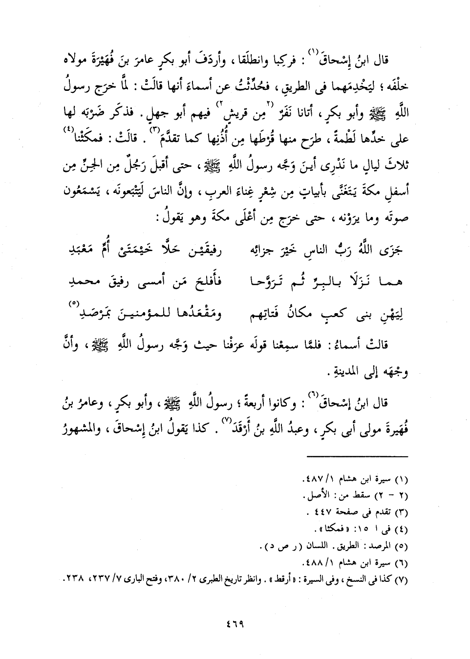 قَالَ ابْنُ إِسْحَاقَ: فَرَكِبَا وَانْطَلَقَا وَأَرْدَفَ أَبُو بَكْرٍ عَامِرَ بْنَ فُهَيْرَةَ مَوْلَاهُ خَلْفَهُ، لِيَخْدِمَهُمَا فِي الطَّرِيقِ، فَحُدِّثْتُ عَنْ أَسْمَاءَ أَنَّهَا قَالَتْ: لَمَّا خَرَجَ رَسُولُ اللَّهِ صَلَّى اللَّهُ عَلَيْهِ وَسَلَّمَ وَأَبُو بَكْرٍ، أَتَانَا نَفَرٌ مِنْ قُرَيْشٍ فِيهِمْ أَبُو جَهْلٍ فَذَكَرَ ضَرْبَهُ لَهَا عَلَى خَدِّهَا لَطْمَةً، طَرَحَ مِنْهَا قُرْطَهَا مِنْ أُذُنِهَا كَمَا تَقَدَّمَ. قَالَتْ: فَمَكَثْنَا ثَلَاثَ لَيَالٍ مَا نَدْرِي أَيْنَ وَجَّهَ رَسُولُ اللَّهِ صَلَّى اللَّهُ عَلَيْهِ وَسَلَّمَ،، حَتَّى أَقْبَلَ رَجُلٌ مِنَ الْجِنِّ مِنْ أَسْفَلِ مَكَّةَ يَتَغَنَّى بِأَبْيَاتٍ مِنْ شِعْرٍ غِنَاءَ الْعَرَبِ، وَإِنَّ النَّاسَ لَيَتْبَعُونَهُ، يَسْمَعُونَ صَوْتَهُ وَمَا يَرَوْنَهُ، حَتَّى خَرَجَ مِنْ أَعْلَى مَكَّةَ وَهُوَ يَقُولُ: