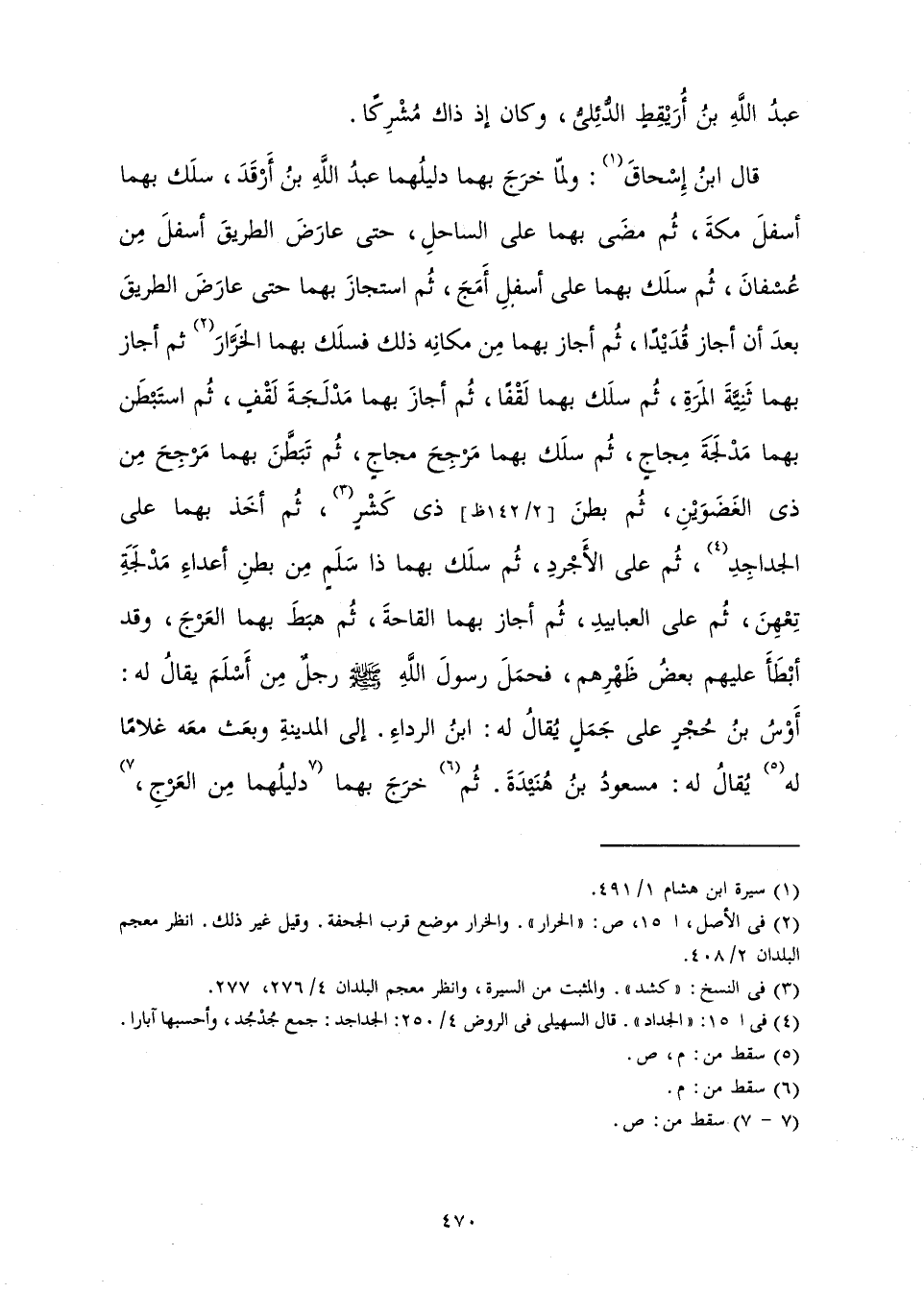 قَالَ ابْنُ إِسْحَاقَ: وَلَمَّا خَرَجَ بِهِمَا دَلِيلُهُمَا عَبْدُ اللَّهِ بْنُ أَرْقَدَ، سَلَكَ بِهِمَا أَسْفَلَ مَكَّةَ ثُمَّ مَضَى بِهِمَا عَلَى السَّاحِلِ حَتَّى عَارَضَ الطَّرِيقَ أَسْفَلَ مِنْ عُسْفَانَ، ثُمَّ سَلَكَ بِهِمَا عَلَى أَسْفَلِ أَمَجَ، ثُمَّ اسْتَجَازَ بِهِمَا حَتَّى عَارَضَ الطَّرِيقَ بَعْدَ أَنْ أَجَازَ قُدَيْدًا، ثُمَّ أَجَازَ بِهِمَا مِنْ مَكَانِهِ ذَلِكَ فَسَلَكَ بِهِمَا الْخَرَّارَ، ثُمَّ أَجَازَ بِهِمَا ثَنِيَّةَ الْمَرَةِ، ثُمَّ سَلَكَ بِهِمَا لَقْفًا، ثُمَّ أَجَازَ بِهِمَا مُدْلَجَةَ لَقْفٍ ثُمَّ اسْتَبْطَنَ بِهِمَا مُدْلَجَةَ مِجَاجٍ، ثُمَّ سَلَكَ بِهِمَا مَرْجِحَ مِجَاجٍ، ثُمَّ تَبَطَّنَ بِهِمَا مَرْجِحَ مِنْ ذِي الْغَضَوَيْنِ، ثُمَّ بَطْنَ ذِي كَشْرٍ، ثُمَّ أَخَذَ بِهِمَا عَلَى الْجُدَاجِدِ، ثُمَّ عَلَى الْأَجْرَدِ، ثُمَّ سَلَكَ بِهِمَا ذَا سَلَمٍ مِنْ بَطْنِ أَعْدَاءِ مَدْلَجَةِ تِعْهِنَ، ثُمَّ عَلَى الْعَبَابِيدِ، ثُمَّ أَجَازَ بِهِمَا الْقَاحَةَ، ثُمَّ هَبَطَ بِهِمَا الْعَرْجَ، وَقَدْ أَبْطَأَ عَلَيْهِمْ بَعْضُ ظَهْرِهِمْ، فَحَمَلَ رَسُولَ اللَّهِ صَلَّى اللَّهُ عَلَيْهِ وَسَلَّمَ رَجُلٌ مِنْ أَسْلَمَ، يُقَالُ لَهُ: أَوْسُ بْنُ حُجْرٍ عَلَى جَمَلٍ يُقَالُ لَهُ: ابْنُ الرِّدَاءِ إِلَى الْمَدِينَةِ، وَبَعَثَ مَعَهُ غُلَامًا لَهُ يُقَالُ لَهُ: مَسْعُودُ بْنُ هُنَيْدَةَ، ثُمَّ خَرَجَ بِهِمَا دَلِيلُهُمَا مِنَ الْعَرْجِ،