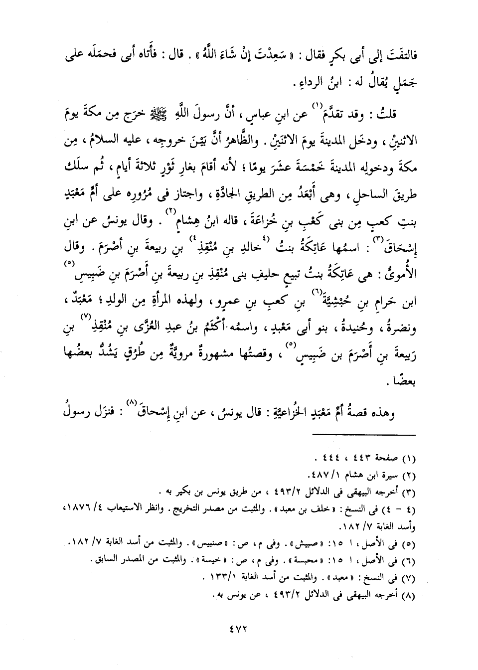 قُلْتُ: وَقَدْ تَقَدَّمَ عَنِ ابْنِ عَبَّاسٍ، أَنَّ رَسُولَ اللَّهِ صَلَّى اللَّهُ عَلَيْهِ وَسَلَّمَ خَرَجَ مِنْ مَكَّةَ يَوْمَ الِاثْنَيْنِ، وَدَخْلَ الْمَدِينَةَ يَوْمَ الِاثْنَيْنِ. وَالظَّاهِرُ أَنْ بَيْنَ خُرُوجِهِ عَلَيْهِ السَّلَامُ، مِنْ مَكَّةَ وَدُخُولِهِ الْمَدِينَةَ خَمْسَةَ عَشَرَ يَوْمًا; لِأَنَّهُ أَقَامَ بِغَارِ ثَوْرٍ ثَلَاثَةَ أَيَّامٍ، ثُمَّ سَلَكَ طَرِيقَ السَّاحِلِ، وَهِيَ أَبْعَدُ مِنَ الطَّرِيقِ الْجَادَّةِ وَاجْتَازَ فِي مُرُورِهِ عَلَى أُمِّ مَعْبَدٍ بِنْتِ كَعْبٍ مِنْ بَنِي كَعْبِ بْنِ خُزَاعَةَ، قَالَهُ ابْنُ هِشَامٍ. وَقَالَ يُونُسُ، عَنِ ابْنِ إِسْحَاقَ: اسْمُهَا عَاتِكَةُ بِنْتُ خَالِدِ بْنِ مُنْقِذِ بْنِ رَبِيعَةَ بْنِ أَصْرَمَ. وَقَالَ الْأُمَوِيُّ: هِيَ عَاتِكَةُ بِنْتُ تَبِيعٍ حَلِيفِ بَنِي مُنْقِذِ بْنِ رَبِيعَةَ بْنِ أَصْرَمَ بْنِ ضَبِيسِ بْنِ حَرَامِ بْنِ حُبْشِيَّةَ بْنِ كَعْبِ بْنِ عَمْرٍو، وَلِهَذِهِ الْمَرْأَةِ مِنَ الْوَلَدِ، مَعْبَدٌ، وَنَضْرَةٌ، وَحُنَيْدَةُ، بَنُو أَبِي مَعْبَدٍ، وَاسْمُهُ أَكْثَمُ بْنُ عَبْدِ الْعُزَّى بْنِ مُنْقِذِ بْنِ رَبِيعَةَ بْنِ أَصْرَمَ بْنِ ضَبِيسٍ، وَقِصَّتُهَا مَشْهُورَةٌ مَرْوِيَّةٌ مِنْ طَرْقٍ يَشُدُّ بَعْضُهَا بَعْضًا.