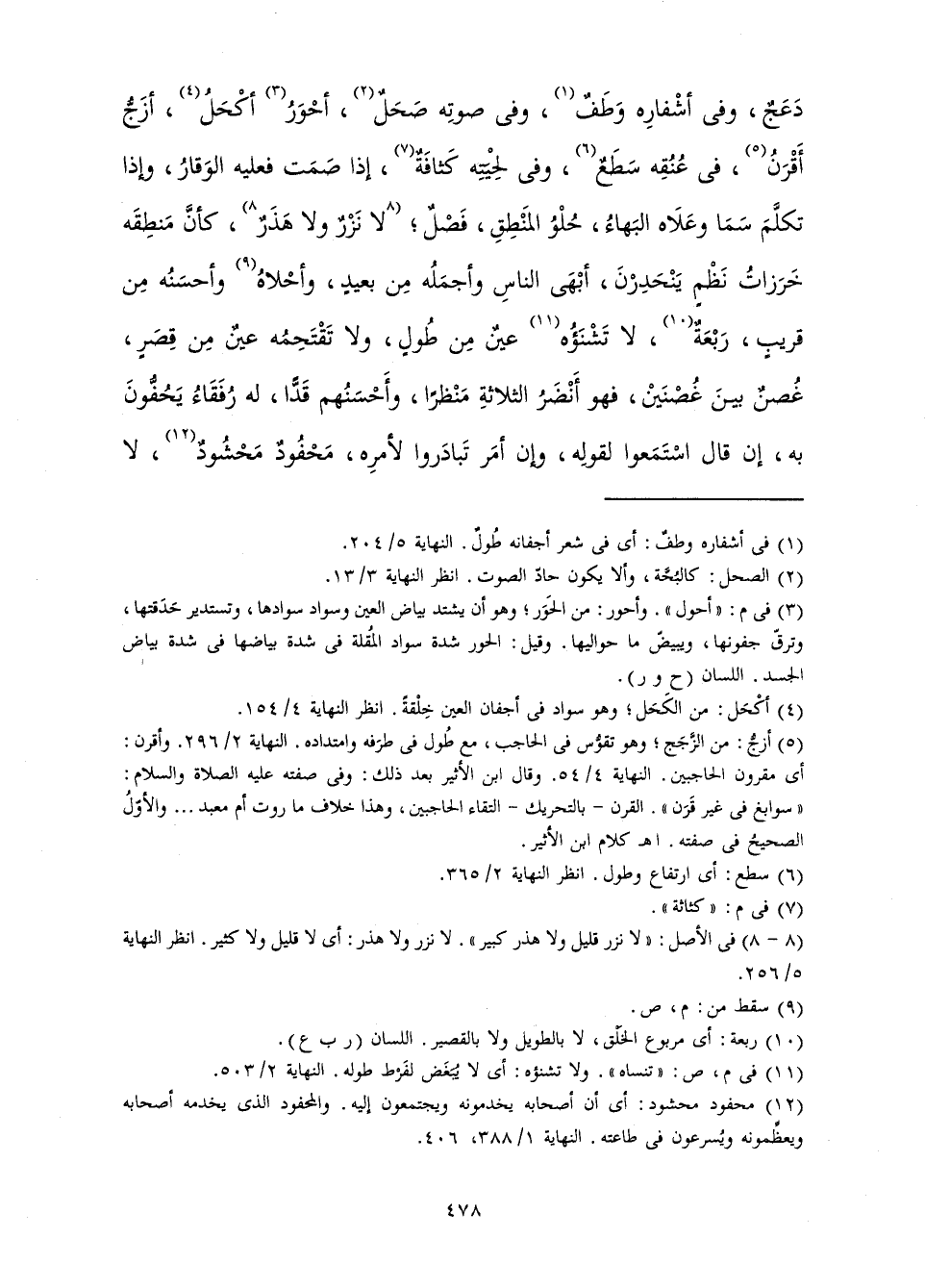 دَعَجٌ، وَفِي أَشْفَارِهِ وَطَفٌ، وَفِي صَوْتِهِ صَحَلٌ، أَحْوَرُ، أَكْحَلُ، أَزَجُّ، أَقْرَنُ، فِي عُنُقِهِ سَطَعٌ، وَفِي لِحْيَتِهِ كَثَافَةٌ، إِذَا صَمَتَ فَعَلَيْهِ الْوَقَارُ، وَإِذَا تَكَلَّمَ سَمَا وَعَلَاهُ الْبَهَاءُ، حُلْوُ الْمَنْطِقِ، فَصْلٌ; لَا نَزْرٌ وَلَا هَذَرٌ، كَأَنَّ مَنْطِقَهُ خَرَزَاتُ نَظْمٍ يَنْحَدِرْنَ، أَبْهَى النَّاسِ وَأَجْمَلُهُ مِنْ بَعِيدٍ، وَأَحْلَاهُ وَأَحْسَنُهُ مِنْ قَرِيبٍ، رَبْعَةٌ، لَا تَشْنَؤُهُ عَيْنٌ مِنْ طُولٍ، وَلَا تَقْتَحِمُهُ عَيْنٌ مَنْ قِصَرٍ، غُصْنٌ بَيْنَ غُصْنَيْنِ، فَهُوَ أَنْضَرُ الثَّلَاثَةِ مَنْظَرًا، وَأَحْسَنُهُمْ قَدًّا، لَهُ رُفَقَاءُ يَحُفُّونَ بِهِ، إِنْ قَالَ اسْتَمَعُوا لِقَوْلِهِ، وَإِنْ أَمَرَ تَبَادَرُوا لِأَمْرِهِ، مَحْفُودٌ مَحْشُودٌ، لَا