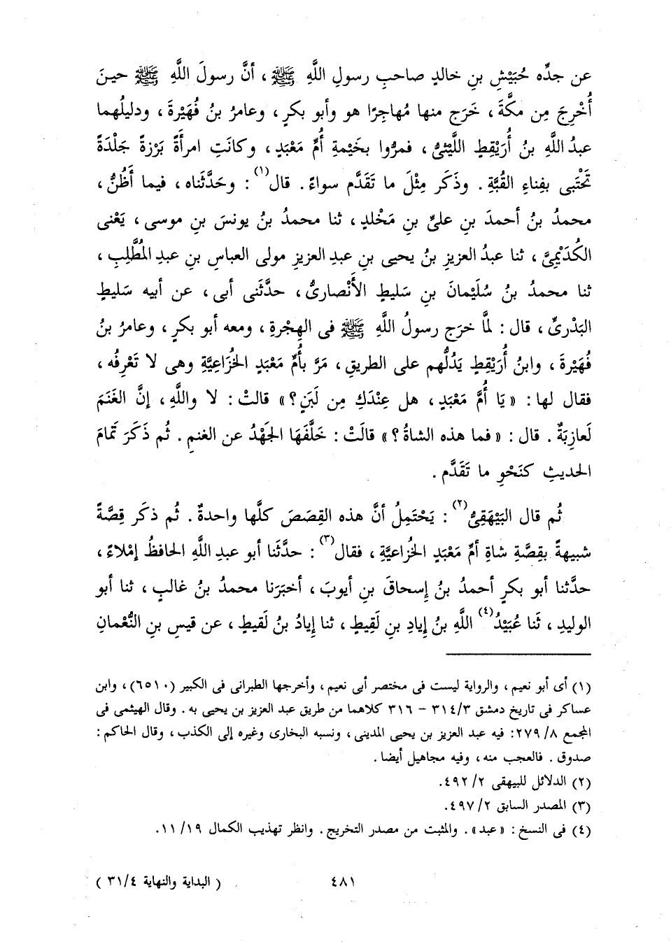 عَنْ جَدِّهِ حُبَيْشِ بْنِ خَالِدٍ صَاحِبِ رَسُولِ اللَّهِ صَلَّى اللَّهُ عَلَيْهِ وَسَلَّمَ، أَنَّ رَسُولَ اللَّهِ صَلَّى اللَّهُ عَلَيْهِ وَسَلَّمَ حِينَ أُخْرِجَ مِنْ مَكَّةَ خَرَجَ مِنْهَا مُهَاجِرًا، هُوَ وَأَبُو بَكْرٍ، وَعَامِرُ بْنُ فُهَيْرَةَ، وَدَلِيلُهُمَا عَبْدُ اللَّهِ بْنُ أُرَيْقِطٍ اللَّيْثِيُّ، فَمَرُّوا بِخَيْمَةِ أُمِّ مَعْبَدٍ، وَكَانَتِ امْرَأَةً بَرْزَةً جَلْدَةً تَحْتَبِي بِفِنَاءِ الْقُبَّةِ. وَذَكَرَ مِثْلَ مَا تَقَدَّمَ سَوَاءً. قَالَ: وَحَدَّثْنَاهُ فِيمَا أَظُنُّ مُحَمَّدُ بْنُ أَحْمَدَ بْنِ عَلِيِّ بْنِ مَخْلَدٍ، ثَنَا مُحَمَّدُ بْنُ يُونُسَ بْنِ مُوسَى يَعْنِي الْكُدَيْمِيَّ، ثَنَا عَبْدُ الْعَزِيزِ بْنُ يَحْيَى بْنِ عَبْدِ الْعَزِيزِ مَوْلَى الْعَبَّاسِ بْنِ عَبْدِ الْمُطَّلِبِ، ثَنَا مُحَمَّدُ بْنُ سُلَيْمَانَ بْنِ سَلِيطٍ الْأَنْصَارِيُّ، حَدَّثَنِي أَبِي، عَنْ أَبِيهِ سَلِيطٍ الْبَدْرِيِّ، قَالَ: لَمَّا خَرَجَ رَسُولُ اللَّهِ صَلَّى اللَّهُ عَلَيْهِ وَسَلَّمَ فِي الْهِجْرَةِ وَمَعَهُ أَبُو بَكْرٍ، وَعَامِرُ بْنُ فُهَيْرَةَ، وَابْنُ أُرَيْقِطٍ، يَدُلُّهُمْ عَلَى الطَّرِيقِ، مَرَّ بِأُمِّ مَعْبَدٍ الْخُزَاعِيَّةِ، وَهِيَ لَا تَعْرِفُهُ، فَقَالَ لَهَا: " يَا أُمَّ مَعْبَدٍ، هَلْ عِنْدَكِ مِنْ لَبَنٍ؟ " قَالَتْ: لَا وَاللَّهِ إِنَّ الْغَنَمَ لَعَازِبَةٌ. قَالَ: " فَمَا هَذِهِ الشَّاةُ؟ " قَالَتْ: خَلَّفَهَا الْجَهْدُ عَنِ الْغَنَمِ. ثُمَّ ذَكَرَ تَمَامَ الْحَدِيثِ كَنَحْوِ مَا تَقَدَّمَ.