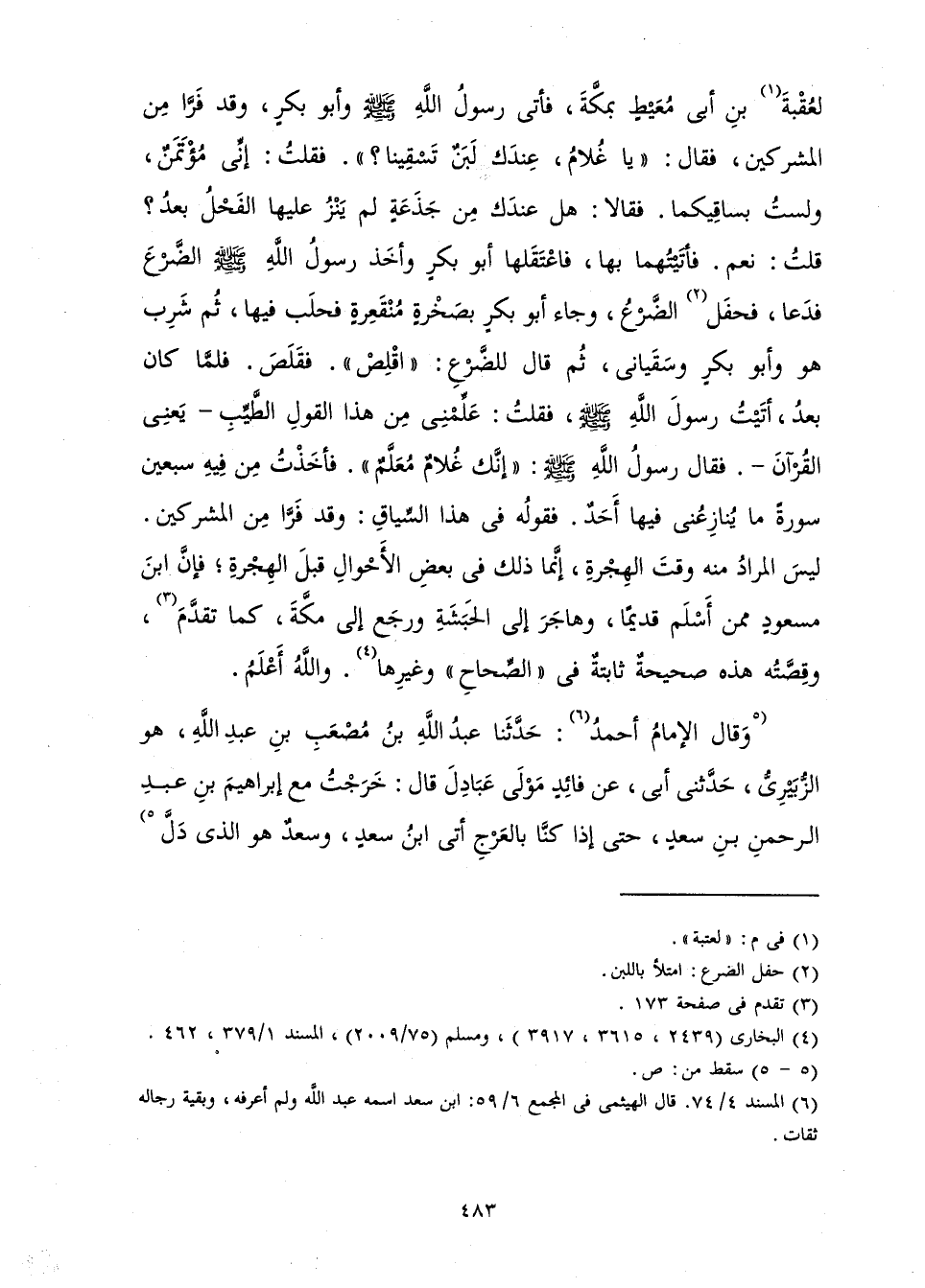 لِعُقْبَةَ بْنِ أَبِي مُعَيْطٍ بِمَكَّةَ، فَأَتَى رَسُولُ اللَّهِ صَلَّى اللَّهُ عَلَيْهِ وَسَلَّمَ وَأَبُو بَكْرٍ، وَقَدْ فَرَّا مِنَ الْمُشْرِكِينَ فَقَالَ: " يَا غُلَامُ، عِنْدَكَ لَبَنٌ تَسْقِينَا؟ " فَقُلْتُ: إِنِّي مُؤْتَمَنٌ وَلَسْتُ بِسَاقِيكُمَا. فَقَالَا: هَلْ عِنْدَكَ مِنْ جَذَعَةٍ لَمْ يَنْزُ عَلَيْهَا الْفَحْلُ بَعْدُ؟ قُلْتُ: " نَعَمْ ". فَأَتَيْتُهُمَا بِهَا، فَاعْتَقَلَهَا أَبُو بَكْرٍ وَأَخَذَ رَسُولُ اللَّهِ صَلَّى اللَّهُ عَلَيْهِ وَسَلَّمَ الضَّرْعَ، فَدَعَا فَحَفَلَ الضَّرْعُ، وَجَاءَ أَبُو بَكْرٍ بِصَخْرَةٍ مُنْقَعِرَةٍ فَحَلَبَ فِيهَا، ثُمَّ شَرِبَ هُوَ وَأَبُو بَكْرٍ وَسَقَيَانِي، ثُمَّ قَالَ لِلضَّرْعِ: " اقْلِصْ ". فَقَلَصَ. فَلَمَّا كَانَ بَعْدُ أَتَيْتُ رَسُولَ اللَّهِ صَلَّى اللَّهُ عَلَيْهِ وَسَلَّمَ، فَقُلْتُ: عَلِّمْنِي مِنْ هَذَا الْقَوْلِ الطَّيِّبِ - يَعْنِي الْقُرْآنَ - فَقَالَ رَسُولُ اللَّهِ صَلَّى اللَّهُ عَلَيْهِ وَسَلَّمَ: " إِنَّكَ غُلَامٌ مُعَلَّمٌ ". فَأَخَذْتُ مِنْ فِيهِ سَبْعِينَ سُورَةً مَا يُنَازِعُنِي فِيهَا أَحَدٌ» . فَقَوْلُهُ فِي هَذَا السِّيَاقِ: وَقَدْ فَرَّا مِنَ الْمُشْرِكِينَ. لَيْسَ الْمُرَادُ مِنْهُ وَقْتَ الْهِجْرَةِ، إِنَّمَا ذَلِكَ فِي بَعْضِ الْأَحْوَالِ قَبْلَ الْهِجْرَةِ، فَإِنَّ ابْنَ مَسْعُودٍ مِمَّنْ أَسْلَمَ قَدِيمًا، وَهَاجَرَ إِلَى الْحَبَشَةِ، وَرَجَعَ إِلَى مَكَّةَ كَمَا تَقَدَّمَ وَقِصَّتُهُ هَذِهِ صَحِيحَةٌ ثَابِتَةٌ فِي " الصِّحَاحِ " وَغَيْرِهَا. وَاللَّهُ أَعْلَمُ.
