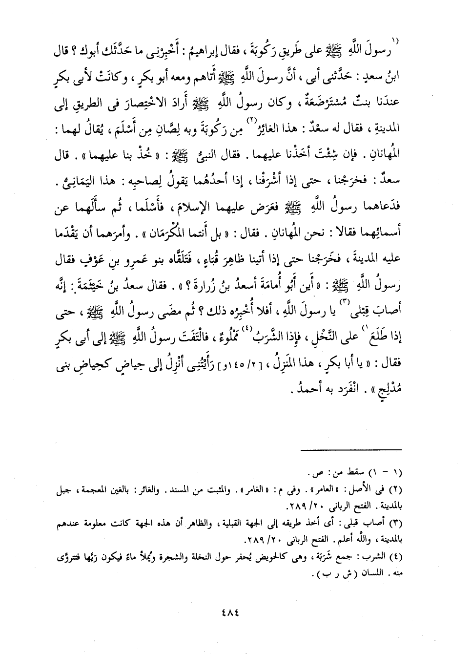 رَسُولَ اللَّهِ صَلَّى اللَّهُ عَلَيْهِ وَسَلَّمَ عَلَى طَرِيقِ رَكُوبَةَ فَقَالَ إِبْرَاهِيمُ: أَخْبِرْنِي مَا حَدَّثَكَ أَبُوكَ؟ . قَالَ ابْنُ سَعْدٍ: حَدَّثَنِي أَبِي أَنَّ رَسُولَ اللَّهِ صَلَّى اللَّهُ عَلَيْهِ وَسَلَّمَ أَتَاهُمْ وَمَعَهُ أَبُو بَكْرٍ، وَكَانَتْ لِأَبِي بَكْرٍ عِنْدَنَا بِنْتٌ مُسْتَرْضَعَةٌ، وَكَانَ رَسُولُ اللَّهِ صَلَّى اللَّهُ عَلَيْهِ وَسَلَّمَ أَرَادَ الِاخْتِصَارَ فِي الطَّرِيقِ إِلَى الْمَدِينَةِ، فَقَالَ لَهُ سَعْدٌ: هَذَا الْغَائِرُ مِنْ رَكُوبَةَ وَبِهِ لِصَّانِ مِنْ أَسْلَمَ، يُقَالُ لَهُمَا: الْمُهَانَانِ. فَإِنْ شِئْتَ أَخَذْنَا عَلَيْهِمَا. فَقَالَ النَّبِيُّ صَلَّى اللَّهُ عَلَيْهِ وَسَلَّمَ: " خُذْ بِنَا عَلَيْهِمَا ". قَالَ سَعْدٌ: فَخَرَجْنَا حَتَّى إِذَا أَشْرَفْنَا، إِذَا أَحَدُهُمَا يَقُولُ لِصَاحِبِهِ: هَذَا الْيَمَانِيُّ. فَدَعَاهُمَا رَسُولُ اللَّهِ صَلَّى اللَّهُ عَلَيْهِ وَسَلَّمَ فَعَرَضَ عَلَيْهِمَا الْإِسْلَامَ، فَأَسْلَمَا ثُمَّ سَأَلَهُمَا عَنْ أَسْمَائِهِمَا، فَقَالَا: نَحْنُ الْمُهَانَانِ. فَقَالَ: " بَلْ أَنْتُمَا الْمُكْرَمَانِ ". وَأَمَرَهُمَا أَنْ يَقْدَمَا عَلَيْهِ الْمَدِينَةَ، فَخَرَجْنَا حَتَّى إِذَا أَتَيْنَا ظَاهِرَ قُبَاءَ، فَتَلَقَّاهُ بَنُو عَمْرِو بْنِ عَوْفٍ، فَقَالَ رَسُولُ اللَّهِ صَلَّى اللَّهُ عَلَيْهِ وَسَلَّمَ: " أَيْنَ أَبُو أُمَامَةَ أَسْعَدُ بْنُ زُرَارَةَ؟ " فَقَالَ سَعْدُ بْنُ خَيْثَمَةَ: إِنَّهُ أَصَابَ قِبْلَى يَا رَسُولَ اللَّهِ، أَفَلَا أُخْبِرُهُ ذَلِكَ؟ ثُمَّ مَضَى رَسُولُ اللَّهِ صَلَّى اللَّهُ عَلَيْهِ وَسَلَّمَ حَتَّى إِذَا طَلَعَ عَلَى النَّخْلِ، فَإِذَا الشَّرْبُ مَمْلُوءٌ، فَالْتَفَتَ رَسُولُ اللَّهِ إِلَى أَبِي بَكْرٍ، فَقَالَ: " يَا أَبَا بَكْرٍ، هَذَا الْمَنْزِلُ رَأَيْتُنِي أَنْزِلُ إِلَى حِيَاضٍ كَحِيَاضِ بَنِي مُدْلِجٍ ". انْفَرَدَ بِهِ أَحْمَدُ.