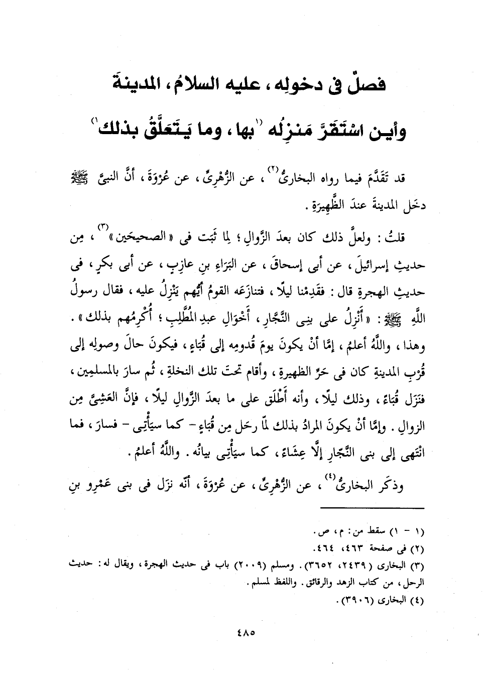 قُلْتُ: وَلَعَلَّ ذَلِكَ كَانَ بَعْدَ الزَّوَالِ; لِمَا ثَبَتَ فِي " الصَّحِيحَيْنِ " مِنْ حَدِيثِ إِسْرَائِيلَ، عَنْ أَبِي إِسْحَاقَ عَنِ الْبَرَاءِ بْنِ عَازِبٍ، عَنْ أَبِي بَكْرٍ، فِي حَدِيثِ الْهِجْرَةِ، قَالَ: «فَقَدِمْنَا لَيْلًا فَتَنَازَعَهُ الْقَوْمُ أَيُّهُمْ يَنْزِلُ عَلَيْهِ، فَقَالَ رَسُولُ اللَّهِ صَلَّى اللَّهُ عَلَيْهِ وَسَلَّمَ: " أَنْزِلُ عَلَى بَنِي النَّجَّارِ، أَخْوَالِ عَبْدِ الْمُطَّلِبِ أُكْرِمُهُمْ بِذَلِكَ» ". وَهَذَا وَاللَّهُ أَعْلَمُ، إِمَّا أَنْ يَكُونَ يَوْمَ قُدُومِهِ إِلَى قُبَاءَ، فَيَكُونُ حَالَ وُصُولِهِ إِلَى قُرْبِ الْمَدِينَةِ كَانَ فِي حَرِّ الظَّهِيرَةِ، وَأَقَامَ تَحْتَ تِلْكَ النَّخْلَةِ، ثُمَّ سَارَ بِالْمُسْلِمِينَ فَنَزَلَ قُبَاءَ، وَذَلِكَ لَيْلًا، وَأَنَّهُ أَطْلَقَ عَلَى مَا بَعْدَ الزَّوَالِ لَيْلًا، فَإِنَّ الْعَشِيَّ مِنَ الزَّوَالِ. وَإِمَّا أَنْ يَكُونَ الْمُرَادُ بِذَلِكَ لَمَّا رَحَلَ مِنْ قُبَاءَ - كَمَا سَيَأْتِي - فَسَارَ فَمَا انْتَهَى إِلَى بَنِي النَّجَّارِ إِلَّا عِشَاءً، كَمَا سَيَأْتِي بَيَانُهُ، وَاللَّهُ أَعْلَمُ.