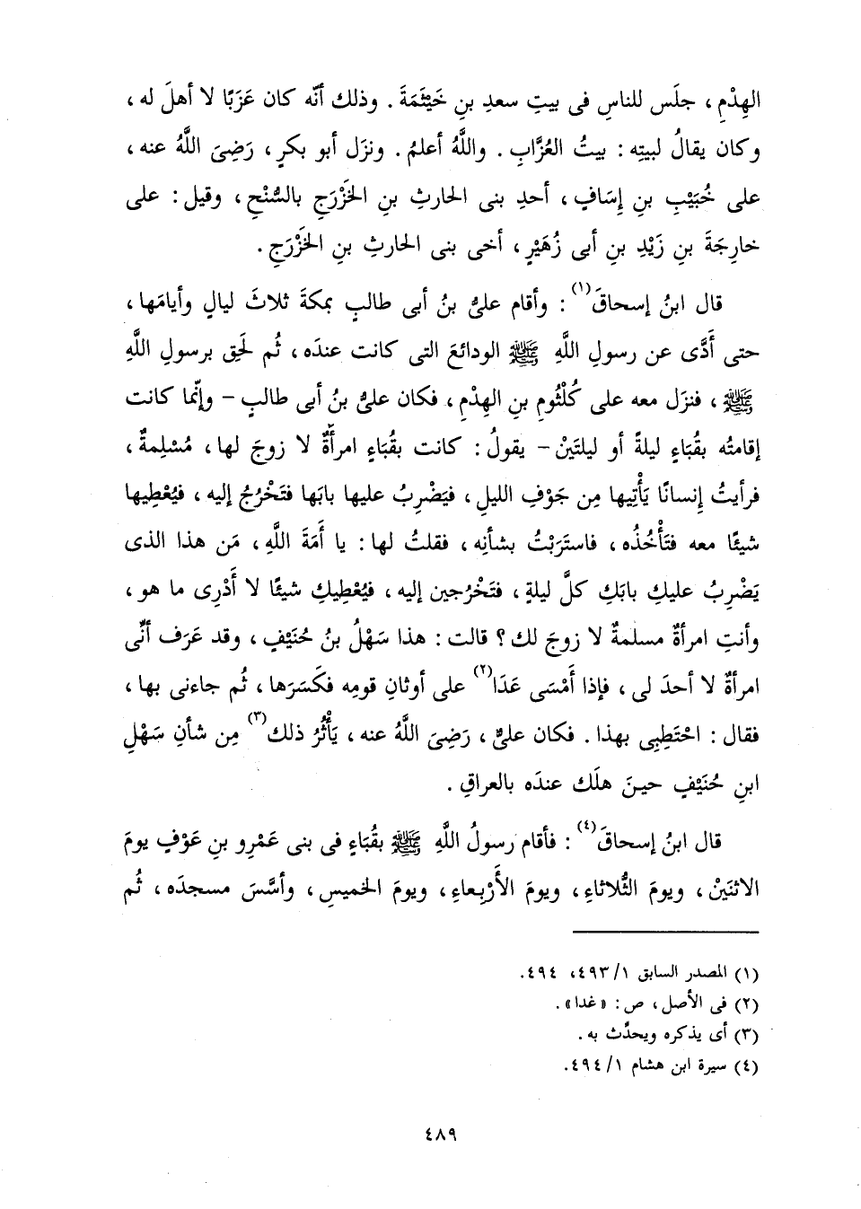 قَالَ ابْنُ إِسْحَاقَ: وَأَقَامَ عَلِيُّ بْنُ أَبِي طَالِبٍ بِمَكَّةَ ثَلَاثَ لَيَالٍ وَأَيَّامَهَا، حَتَّى أَدَّى عَنْ رَسُولِ اللَّهِ صَلَّى اللَّهُ عَلَيْهِ وَسَلَّمَ الْوَدَائِعَ التِي كَانَتْ عِنْدَهُ، ثُمَّ لَحِقَ بِرَسُولِ اللَّهِ صَلَّى اللَّهُ عَلَيْهِ وَسَلَّمَ، فَنَزَلَ مَعَهُ عَلَى كُلْثُومِ بْنِ الْهِدْمِ، فَكَانَ عَلِيُّ بْنُ أَبِي طَالِبٍ - وَإِنَّمَا كَانَتْ إِقَامَتُهُ بِقُبَاءَ لَيْلَةً أَوْ لَيْلَتَيْنِ - يَقُولُ: كَانَتْ بِقُبَاءَ امْرَأَةٌ لَا زَوْجَ لَهَا، مُسْلِمَةٌ، فَرَأَيْتُ إِنْسَانًا يَأْتِيهَا مِنْ جَوْفِ اللَّيْلِ، فَيَضْرِبُ عَلَيْهَا بَابَهَا فَتَخْرُجُ إِلَيْهِ، فَيُعْطِيهَا شَيْئًا مَعَهُ فَتَأْخُذُهُ، فَاسْتَرَبْتُ بِشَأْنِهِ فَقُلْتُ لَهَا: يَا أَمَةَ اللَّهِ، مَنْ هَذَا الَّذِي يَضْرِبُ عَلَيْكِ بَابَكَ كُلَّ لَيْلَةٍ، فَتَخْرُجِينَ إِلَيْهِ، فَيُعْطِيَكِ شَيْئًا لَا أَدْرِي مَا هُوَ، وَأَنْتِ امْرَأَةٌ مُسْلِمَةٌ لَا زَوْجَ لَكِ؟ قَالَتْ: هَذَا سَهْلُ بْنُ حُنَيْفٍ، وَقَدْ عَرَفَ أَنِّي امْرَأَةٌ لَا أَحَدَ لِي، فَإِذَا أَمْسَى عَدَا عَلَى أَوْثَانِ قَوْمِهِ فَكَسَرَهَا، ثُمَّ جَاءَنِي بِهَا، فَقَالَ: احْتَطِبِي بِهَذَا. فَكَانَ عَلِيٌّ رَضِيَ اللَّهُ عَنْهُ يَأْثُرُ ذَلِكَ مِنْ شَأْنِ سَهْلِ بْنِ حُنَيْفٍ حِينَ هَلَكَ عِنْدَهُ بِالْعِرَاقِ.