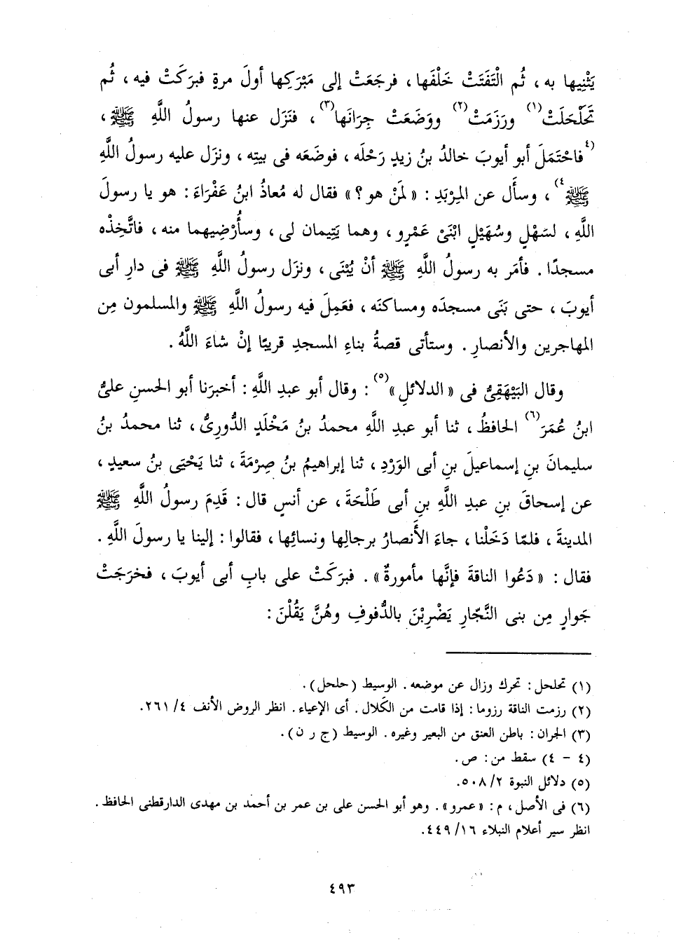 وَقَالَ الْبَيْهَقِيُّ فِي " الدَّلَائِلِ ": وَقَالَ أَبُو عَبْدِ اللَّهِ: أَخْبَرَنَا أَبُو الْحَسَنِ عَلِيُّ بْنُ عُمَرَ الْحَافِظُ، ثَنَا أَبُو عَبْدِ اللَّهِ مُحَمَّدُ بْنُ مَخْلَدٍ الدُّورِيُّ، ثَنَا مُحَمَّدُ بْنُ سُلَيْمَانَ بْنِ إِسْمَاعِيلَ بْنِ أَبِي الْوَرْدِ، ثَنَا إِبْرَاهِيمُ بْنُ صِرْمَةَ، ثَنَا يَحْيَى بْنُ سَعِيدٍ، عَنْ إِسْحَاقَ بْنِ عَبْدِ اللَّهِ بْنِ أَبِي طَلْحَةَ، عَنْ أَنَسٍ قَالَ: «قَدِمَ رَسُولُ اللَّهِ صَلَّى اللَّهُ عَلَيْهِ وَسَلَّمَ الْمَدِينَةَ، فَلَمَّا دَخَلْنَا جَاءَ الْأَنْصَارُ بِرِجَالِهَا وَنِسَائِهَا، فَقَالُوا: إِلَيْنَا يَا رَسُولَ اللَّهِ. فَقَالَ: " دَعُوا النَّاقَةَ فَإِنَّهَا مَأْمُورَةٌ» ". فَبَرَكَتْ عَلَى بَابِ أَبِي أَيُّوبَ، فَخَرَجَتْ جَوَارٍ مِنْ بَنِي النَّجَّارِ يَضْرِبْنَ بِالدُّفُوفِ وَهُنَّ يَقُلْنَ: