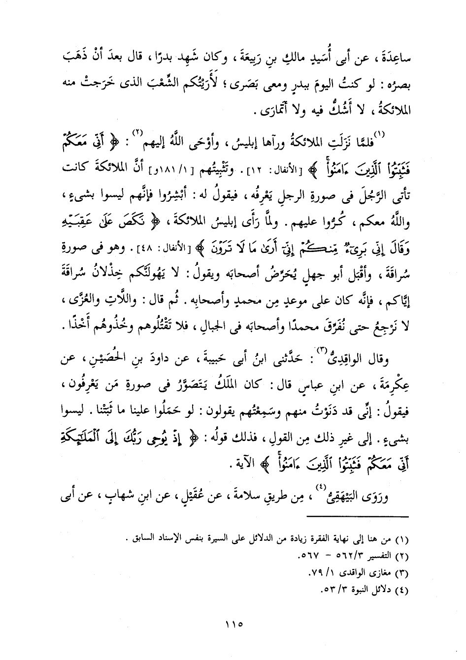وَقَالَ الْوَاقِدِيُّ: حَدَّثَنِي ابْنُ أَبِي حَبِيبَةَ، عَنْ دَاوُدَ بْنِ الْحُصَيْنِ، عَنْ عِكْرِمَةَ، عَنِ ابْنِ عَبَّاسٍ قَالَ: كَانَ الْمَلَكُ يَتَصَوَّرُ فِي صُورَةِ مَنْ يَعْرِفُونَ، فَيَقُولُ: إِنِّي قَدْ دَنَوْتُ مِنْهُمْ وَسَمِعْتُهُمْ يَقُولُونَ: لَوْ حَمَلُوا عَلَيْنَا مَا ثَبَتْنَا. لَيْسُوا بِشَيْءٍ. إِلَى غَيْرِ ذَلِكَ مِنَ الْقَوْلِ، فَذَلِكَ قَوْلُهُ {إِذْ يُوحِي رَبُّكَ إِلَى الْمَلَائِكَةِ أَنِّي مَعَكُمْ فَثَبِّتُوا الَّذِينَ آمَنُوا} [الأنفال: 12] الْآيَةَ.