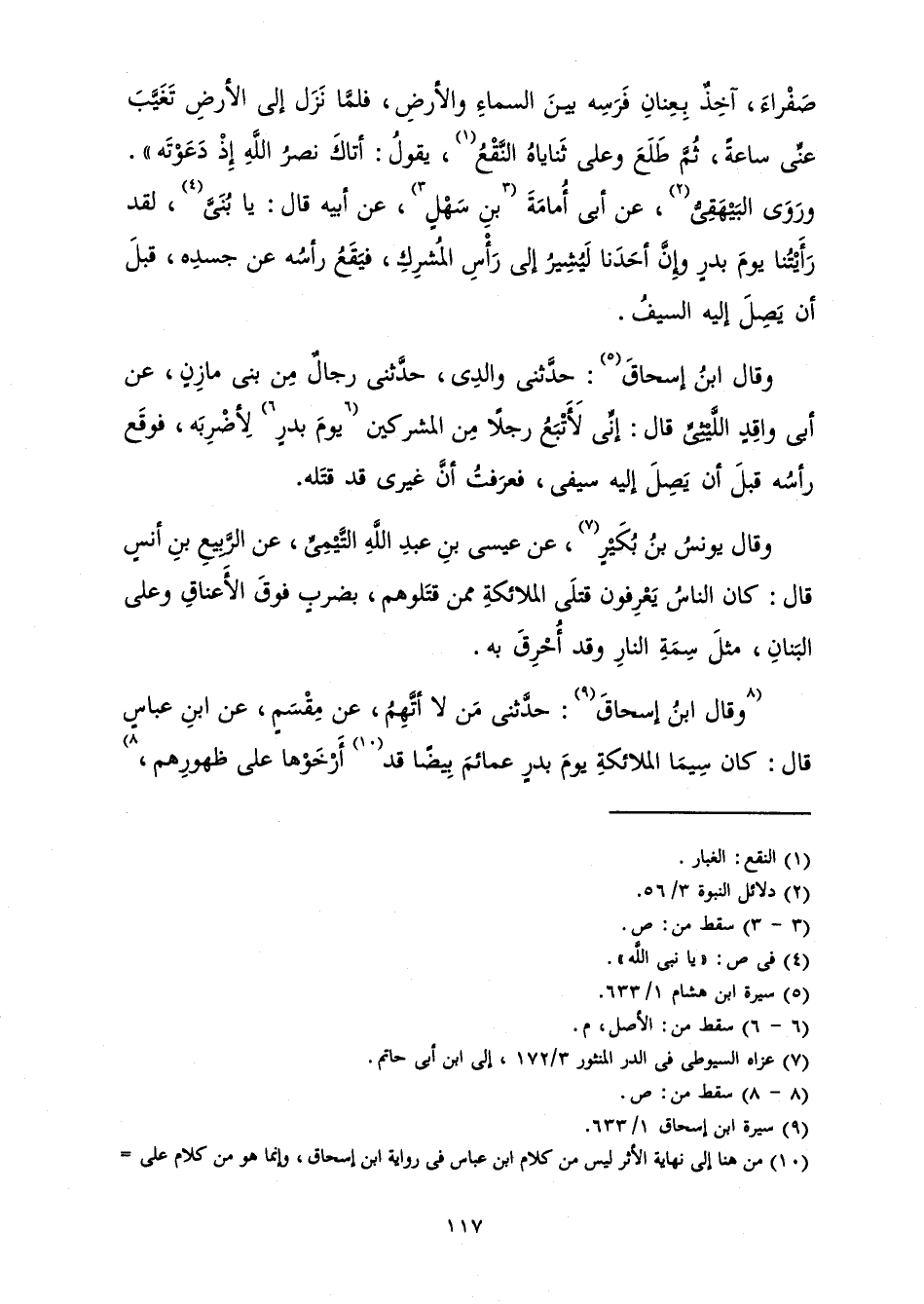 صَفْرَاءَ، آخِذٌ بِعِنَانِ فَرَسِهِ بَيْنَ السَّمَاءِ وَالْأَرْضِ، فَلَمَّا نَزَلَ إِلَى الْأَرْضِ تَغَيَّبَ عَنِّي سَاعَةً، ثُمَّ طَلَعَ وَعَلَى ثَنَايَاهُ النَّقْعُ، يَقُولُ: أَتَاكَ نَصْرُ اللَّهِ إِذْ دَعَوْتَهُ» . وَرَوَى الْبَيْهَقِيُّ، عَنْ أَبِي أُمَامَةَ بْنِ سَهْلٍ، عَنْ أَبِيهِ قَالَ: يَا بُنَيَّ، لَقَدْ رَأَيْتُنَا يَوْمَ بَدْرٍ وَإِنَّ أَحَدَنَا لَيُشِيرُ إِلَى رَأْسِ الْمُشْرِكِ، فَيَقَعُ رَأْسُهُ عَنْ جَسَدِهِ، قَبْلَ أَنْ يَصِلَ إِلَيْهِ السَّيْفُ.