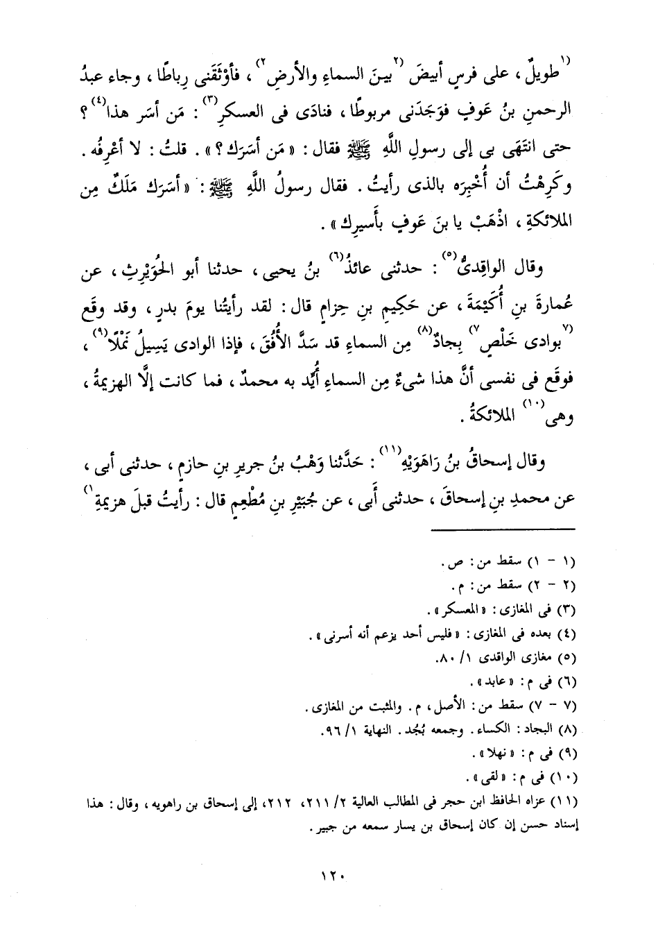 طَوِيلٌ، عَلَى فَرَسٍ أَبْيَضَ بَيْنَ السَّمَاءِ وَالْأَرْضِ، فَأَوْثَقَنِي رِبَاطًا، وَجَاءَ عَبْدُ الرَّحْمَنِ بْنُ عَوْفٍ فَوَجَدَنِي مَرْبُوطًا، فَنَادَى فِي الْعَسْكَرِ: مَنْ أَسَرَ هَذَا؟ حَتَّى انْتَهَى بِي إِلَى رَسُولِ اللَّهِ صَلَّى اللَّهُ عَلَيْهِ وَسَلَّمَ فَقَالَ: مَنْ أَسَرَكَ؟ قُلْتُ: لَا أَعْرِفُهُ. وَكَرِهْتُ أَنْ أُخْبِرَهُ بِالَّذِي رَأَيْتُ. فَقَالَ رَسُولُ اللَّهِ صَلَّى اللَّهُ عَلَيْهِ وَسَلَّمَ: أَسَرَكَ مَلَكٌ مِنَ الْمَلَائِكَةِ، اذْهَبْ يَا ابْنَ عَوْفٍ بِأَسِيرِكَ» .