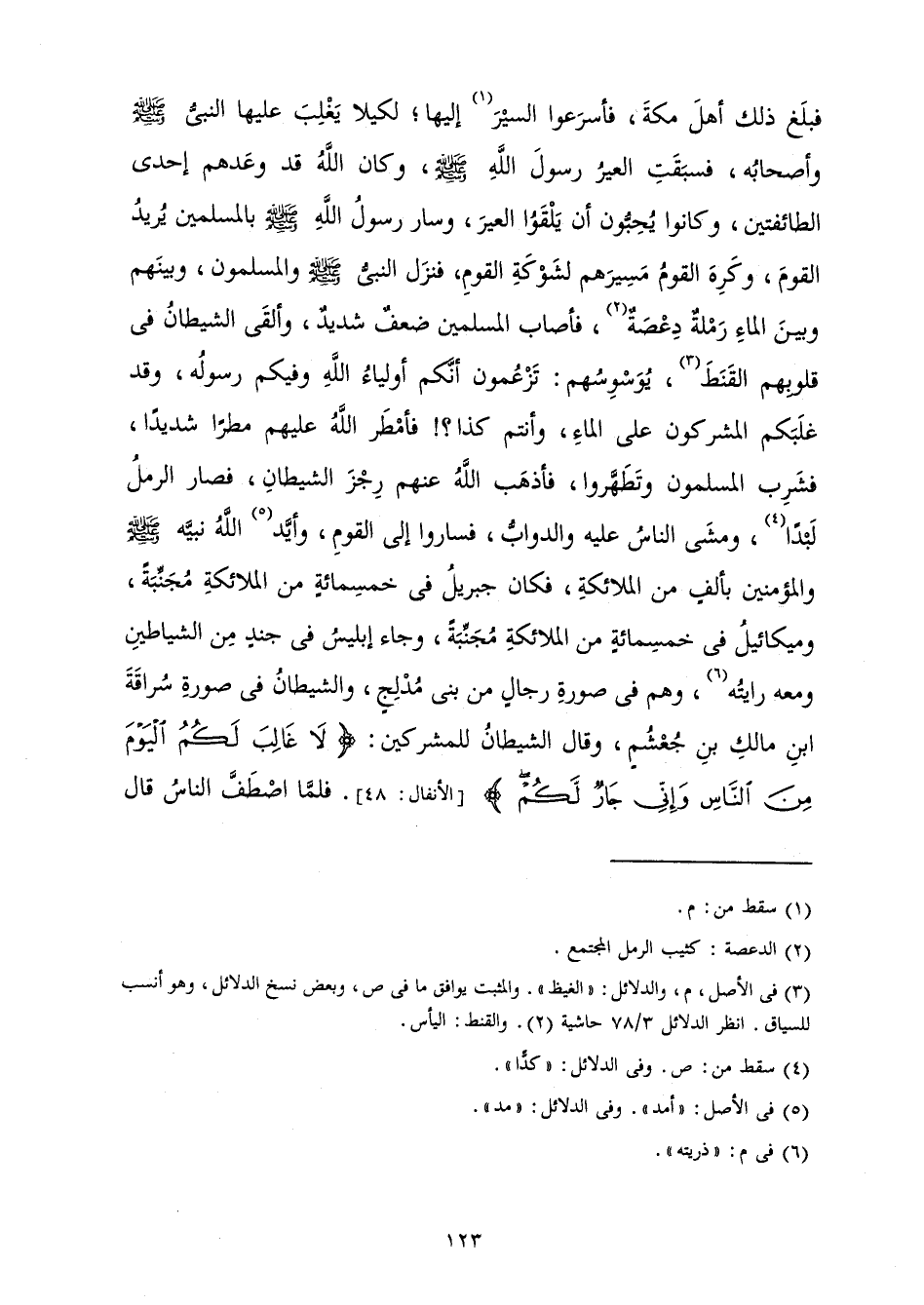 فَبَلَغَ ذَلِكَ أَهْلَ مَكَّةَ، فَأَسْرَعُوا السَّيْرَ إِلَيْهَا، لِكَيْلَا يَغْلِبَ عَلَيْهَا النَّبِيُّ صَلَّى اللَّهُ عَلَيْهِ وَسَلَّمَ وَأَصْحَابُهُ، فَسَبَقَتِ الْعِيرُ رَسُولَ اللَّهِ صَلَّى اللَّهُ عَلَيْهِ وَسَلَّمَ، وَكَانَ اللَّهُ قَدْ وَعَدَهُمْ إِحْدَى الطَّائِفَتَيْنِ، وَكَانُوا يُحِبُّونَ أَنْ يَلْقَوُا الْعِيرَ، وَسَارَ رَسُولُ اللَّهِ صَلَّى اللَّهُ عَلَيْهِ وَسَلَّمَ بِالْمُسْلِمِينَ يُرِيدُ الْقَوْمَ، وَكَرِهَ الْقَوْمُ مَسِيرَهُمْ لِشَوْكَةِ الْقَوْمِ، فَنَزَلَ النَّبِيُّ صَلَّى اللَّهُ عَلَيْهِ وَسَلَّمَ وَالْمُسْلِمُونَ، وَبَيْنَهُمْ وَبَيْنَ الْمَاءِ رَمْلَةٌ دِعْصَةٌ، فَأَصَابَ الْمُسْلِمِينَ ضَعْفٌ شَدِيدٌ، وَأَلْقَى الشَّيْطَانُ فِي قُلُوبِهِمُ الْقَنَطَ، يُوَسْوِسُهُمْ: تَزْعُمُونَ أَنَّكُمْ أَوْلِيَاءُ اللَّهِ وَفِيكُمْ رَسُولُهُ وَقَدْ غَلَبَكُمُ الْمُشْرِكُونَ عَلَى الْمَاءِ، وَأَنْتُمْ كَذَا؟! فَأَمْطَرَ اللَّهُ عَلَيْهِمْ مَطَرًا شَدِيدًا، فَشَرِبَ الْمُسْلِمُونَ وَتَطَهَّرُوا، فَأَذْهَبَ اللَّهُ عَنْهُمْ رِجْزَ الشَّيْطَانِ، فَصَارَ الرَّمْلُ لَبْدًا، وَمَشَى النَّاسُ عَلَيْهِ وَالدَّوَابُّ، فَسَارُوا إِلَى الْقَوْمِ، وَأَيَّدَ اللَّهُ نَبِيَّهُ وَالْمُؤْمِنِينَ بِأَلْفٍ مِنَ الْمَلَائِكَةِ، فَكَانَ جِبْرِيلُ فِي خَمْسِمِائَةٍ مِنَ الْمَلَائِكَةِ مُجَنِّبَةً، وَمِيكَائِيلُ فِي خَمْسِمِائَةٍ مِنَ الْمَلَائِكَةِ مُجَنِّبَةً، وَجَاءَ إِبْلِيسُ فِي جُنْدِ الشَّيَاطِينِ وَمَعَهُ رَايَتُهُ، وَهُمْ فِي صُورَةِ رِجَالٍ مِنْ بَنِي مُدْلِجٍ، وَالشَّيْطَانُ فِي صُورَةِ سُرَاقَةَ بْنِ مَالِكِ بْنِ جُعْشُمٍ، وَقَالَ الشَّيْطَانُ لِلْمُشْرِكِينَ: {لَا غَالِبَ لَكُمُ الْيَوْمَ مِنَ النَّاسِ وَإِنِّي جَارٌ لَكُمْ} [الأنفال: 48] فَلَمَّا اصْطَفَّ النَّاسُ قَالَ