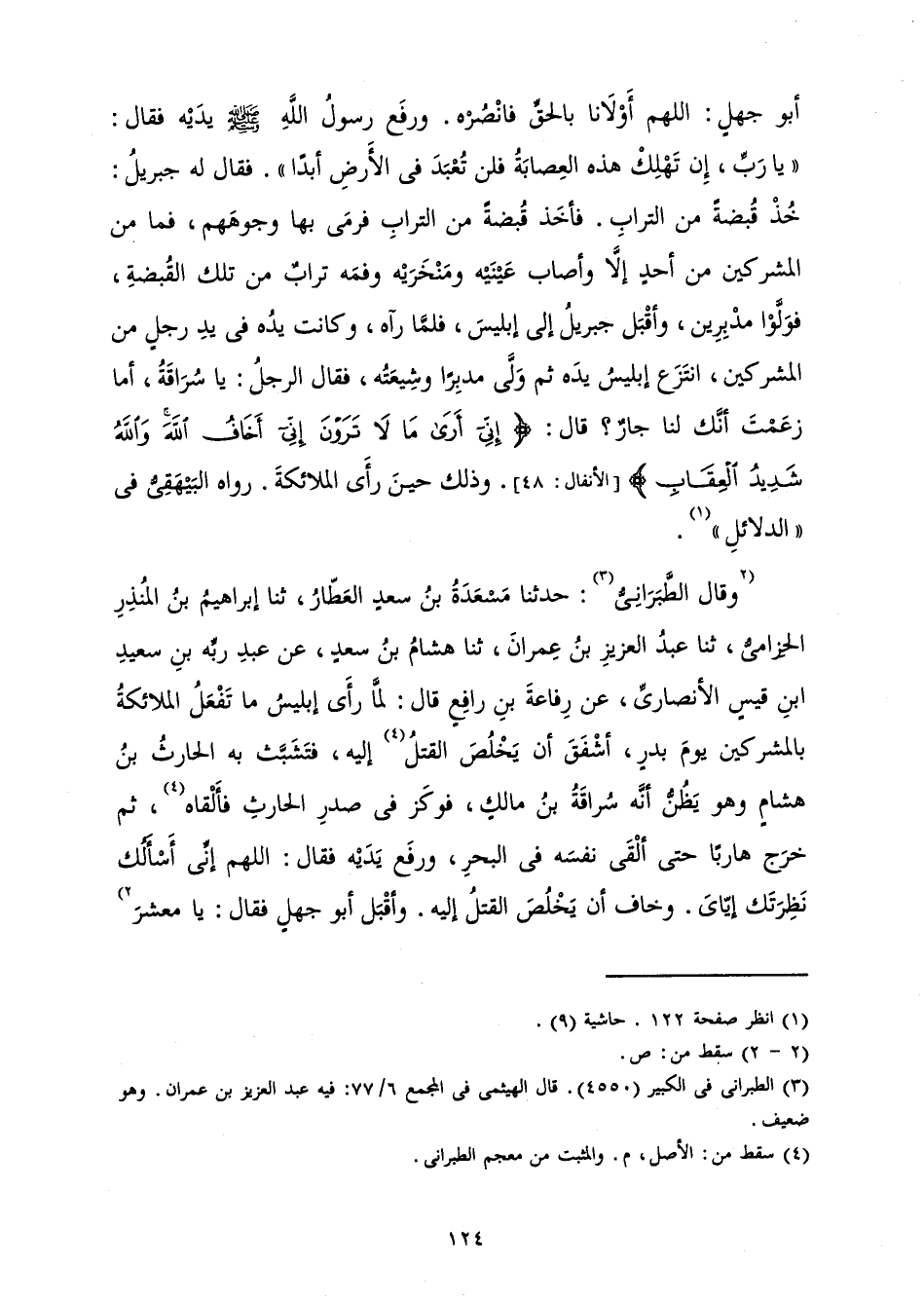 أَبُو جَهْلٍ: اللَّهُمَّ أَوْلَانَا بِالْحَقِّ فَانْصُرْهُ. وَرَفَعَ رَسُولُ اللَّهِ صَلَّى اللَّهُ عَلَيْهِ وَسَلَّمَ يَدَيْهِ فَقَالَ: يَا رَبِّ، إِنْ تَهْلِكْ هَذِهِ الْعِصَابَةُ فَلَنْ تُعْبَدَ فِي الْأَرْضِ أَبَدًا. فَقَالَ لَهُ جِبْرِيلُ: خُذْ قَبْضَةً مِنَ التُّرَابِ. فَأَخَذَ قَبْضَةً مِنَ التُّرَابِ فَرَمَى بِهَا وُجُوهَهُمْ، فَمَا مِنَ الْمُشْرِكِينَ مِنْ أَحَدٍ إِلَّا وَأَصَابَ عَيْنَيْهِ وَمَنْخَرَيْهِ وَفَمَهُ تُرَابٌ مِنْ تِلْكَ الْقَبْضَةِ، فَوَلَّوْا مُدْبِرِينَ، وَأَقْبَلَ جِبْرِيلُ إِلَى إِبْلِيسَ، فَلَمَّا رَآهُ وَكَانَتْ يَدُهُ فِي يَدِ رَجُلٍ مِنَ الْمُشْرِكِينَ، انْتَزَعَ إِبْلِيسُ يَدَهُ ثُمَّ وَلَّى مُدْبِرًا وَشِيعَتُهُ، فَقَالَ الرَّجُلُ: يَا سُرَاقَةُ، أَمَا زَعَمْتَ أَنَّكَ لَنَا جَارٌ؟ قَالَ: {إِنِّي أَرَى مَا لَا تَرَوْنَ إِنِّي أَخَافُ اللَّهَ وَاللَّهُ شَدِيدُ الْعِقَابِ} [الأنفال: 48] وَذَلِكَ حِينَ رَأَى الْمَلَائِكَةَ. رَوَاهُ الْبَيْهَقِيُّ فِي الدَّلَائِلِ.