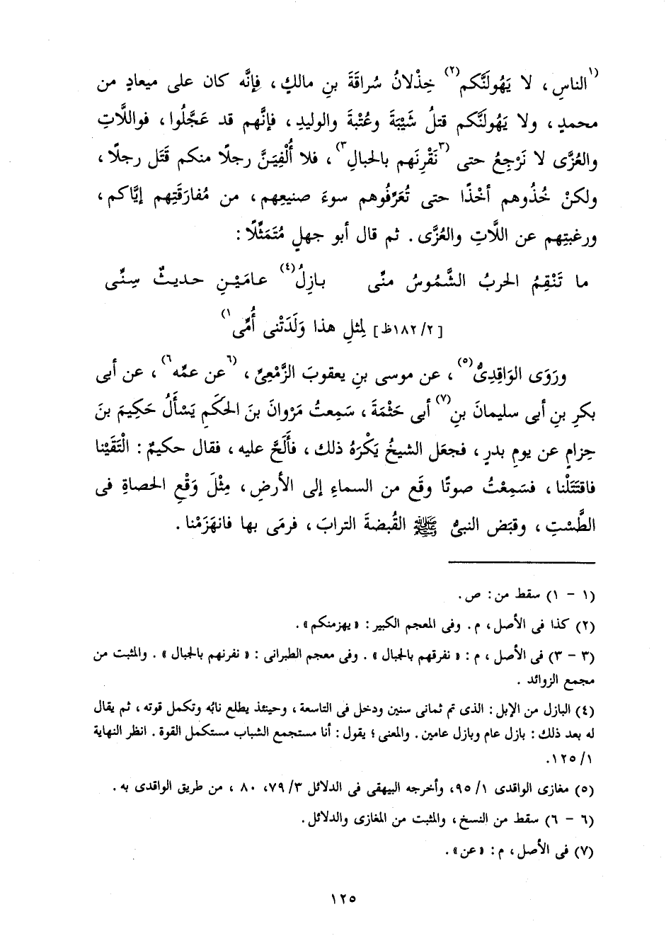 النَّاسِ، لَا يَهُولَنَّكُمْ خِذْلَانُ سُرَاقَةَ بْنِ مَالِكٍ، فَإِنَّهُ كَانَ عَلَى مِيعَادٍ مِنْ مُحَمَّدٍ، وَلَا يَهُولَنَّكُمْ قَتْلُ شَيْبَةَ وَعُتْبَةَ وَالْوَلِيدِ، فَإِنَّهُمْ قَدْ عَجَّلُوا، فَوَاللَّاتِ وَالْعُزَّى لَا نَرْجِعُ حَتَّى نُفَرِّقَهُمْ بِالْحِبَالِ، فَلَا أُلْفِيَنَّ رَجُلًا مِنْكُمْ قَتَلَ رَجُلًا، وَلَكِنْ خُذُوهُمْ أَخْذًا حَتَّى تُعَرِّفُوهُمْ سُوءَ صَنِيعِهِمْ، مِنْ مُفَارَقَتِهِمْ إِيَّاكُمْ، وَرَغْبَتِهِمْ عَنِ اللَّاتِ وَالْعُزَّى. ثُمَّ قَالَ أَبُو جَهْلٍ مُتَمَثِّلًا: