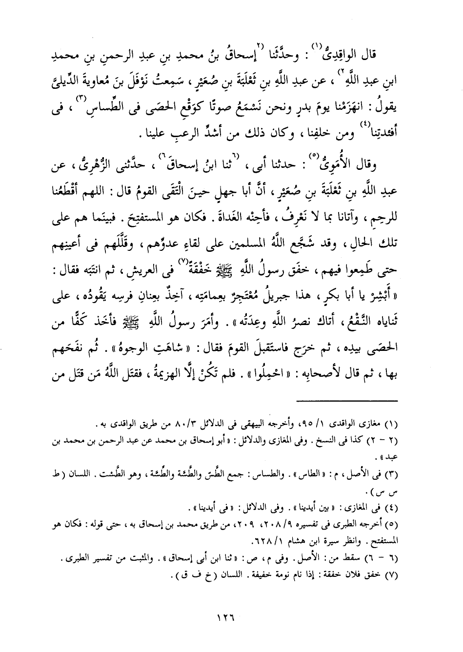 قَالَ الْوَاقِدِيُّ: وَحَدَّثَنَا إِسْحَاقُ بْنُ مُحَمَّدِ بْنِ عَبْدِ الرَّحْمَنِ بْنِ مُحَمَّدِ بْنِ عَبْدِ اللَّهِ، عَنْ عَبْدِ اللَّهِ بْنِ ثَعْلَبَةَ بْنِ صُعَيْرٍ، سَمِعْتُ نَوْفَلَ بْنَ مُعَاوِيَةَ الدِّيلِيَّ يَقُولُ: انْهَزَمْنَا يَوْمَ بَدْرٍ وَنَحْنُ نَسْمَعُ صَوْتًا كَوَقْعِ الْحَصَى فِي الطِّسَاسِ، فِي أَفْئِدَتِنَا وَمِنْ خَلْفِنَا، وَكَانَ ذَلِكَ مِنْ أَشَدِّ الرُّعْبِ عَلَيْنَا.