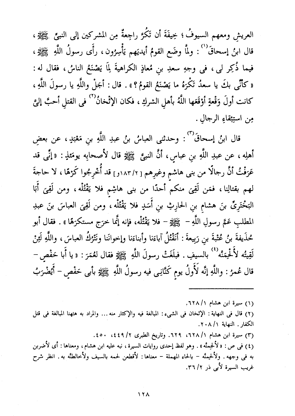 قَالَ ابْنُ إِسْحَاقَ: وَحَدَّثَنِي الْعَبَّاسُ بْنُ عَبْدِ اللَّهِ بْنِ مَعْبَدٍ، عَنْ بَعْضِ أَهْلِهِ، عَنْ عَبْدِ اللَّهِ بْنِ عَبَّاسٍ، أَنَّ النَّبِيَّ صَلَّى اللَّهُ عَلَيْهِ وَسَلَّمَ قَالَ لِأَصْحَابِهِ يَوْمَئِذٍ: إِنِّي قَدْ عَرَفْتُ أَنَّ رِجَالًا مِنْ بَنِي هَاشِمٍ وَغَيْرِهِمْ قَدْ أُخْرِجُوا كَرْهًا، لَا حَاجَةَ لَهُمْ بِقِتَالِنَا، فَمَنْ لَقِيَ مِنْكُمْ أَحَدًا مِنْ بَنِي هَاشِمٍ فَلَا يَقْتُلْهُ، وَمَنْ لَقِيَ أَبَا الْبَخْتَرِيِّ بْنَ هِشَامِ بْنِ الْحَارِثِ بْنِ أَسَدٍ فَلَا يَقْتُلْهُ، وَمَنْ لَقِيَ الْعَبَّاسَ بْنَ عَبْدِ الْمُطَّلِبِ عَمَّ رَسُولِ اللَّهِ صَلَّى اللَّهُ عَلَيْهِ وَسَلَّمَ فَلَا يَقْتُلْهُ، فَإِنَّهُ إِنَّمَا خَرَجَ مُسْتَكْرَهًا. فَقَالَ أَبُو حُذَيْفَةَ بْنُ عُتْبَةَ بْنِ رَبِيعَةَ: أَنَقْتُلُ آبَاءَنَا وَأَبْنَاءَنَا وَإِخْوَانَنَا وَنَتْرُكُ الْعَبَّاسَ، وَاللَّهِ لَئِنْ لَقِيتُهُ لَأَلْحِمَنَّهُ بِالسَّيْفِ. فَبَلَغَتْ رَسُولَ اللَّهِ صَلَّى اللَّهُ عَلَيْهِ وَسَلَّمَ فَقَالَ لِعُمَرَ: يَا أَبَا حَفْصٍ - قَالَ عُمَرُ: وَاللَّهِ إِنَّهُ لَأَوَّلُ يَوْمٍ كَنَّانِي فِيهِ رَسُولُ اللَّهِ صَلَّى اللَّهُ عَلَيْهِ وَسَلَّمَ بِأَبِي حَفْصٍ - أَيُضْرَبُ