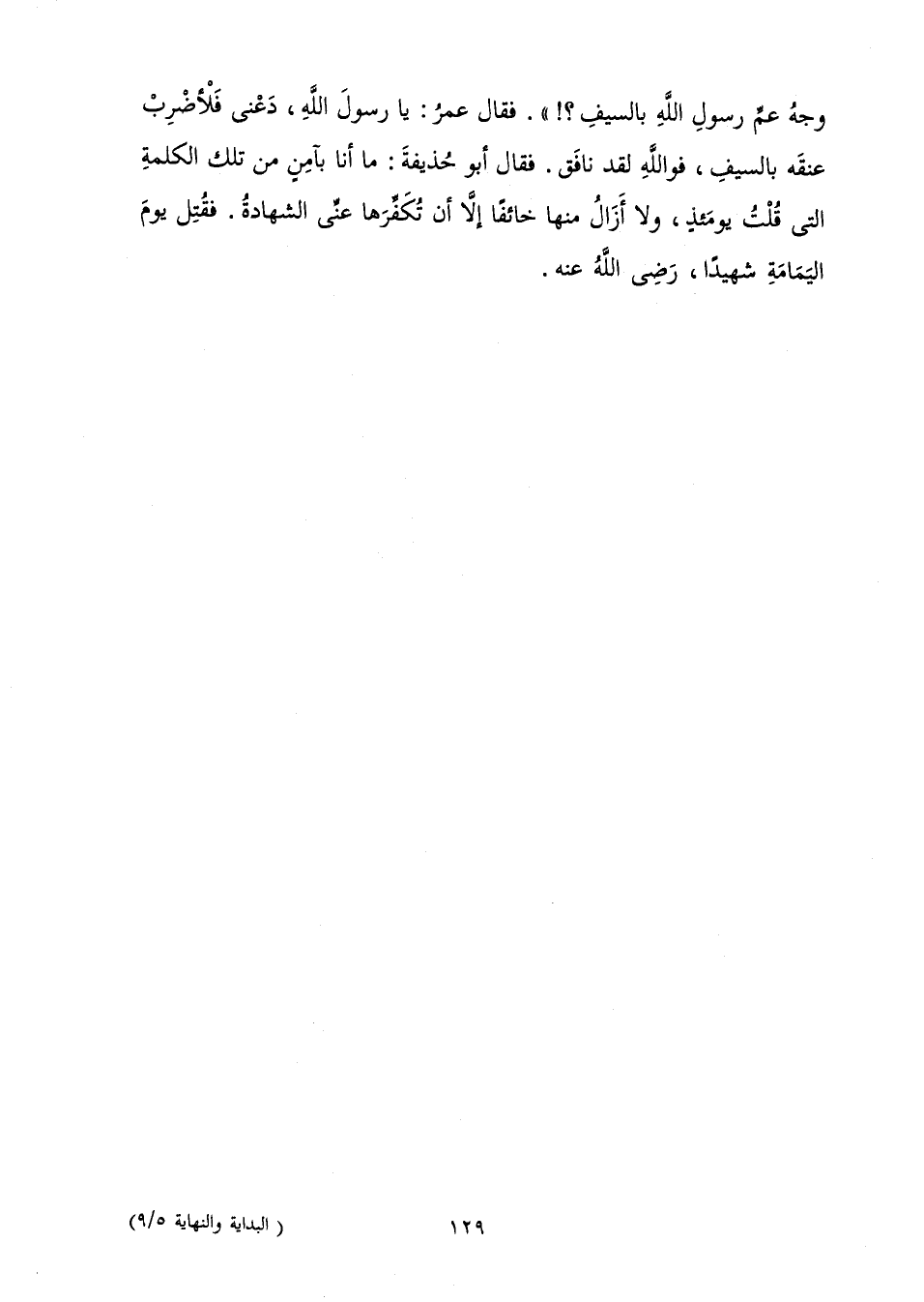 وَجْهُ عَمِّ رَسُولِ اللَّهِ بِالسَّيْفِ؟! فَقَالَ عُمَرُ: يَا رَسُولَ اللَّهِ، دَعْنِي فَلْأَضْرِبْ عُنُقَهُ بِالسَّيْفِ، فَوَاللَّهِ لَقَدْ نَافَقَ. فَقَالَ أَبُو حُذَيْفَةَ: مَا أَنَا بِآمِنٍ مِنْ تِلْكَ الْكَلِمَةِ الَّتِي قُلْتُ يَوْمَئِذٍ، وَلَا أَزَالُ مِنْهَا خَائِفًا إِلَّا أَنْ تُكَفِّرَهَا عَنِّي الشَّهَادَةُ. فَقُتِلَ يَوْمَ الْيَمَامَةِ شَهِيدًا، رَضِيَ اللَّهُ عَنْهُ.