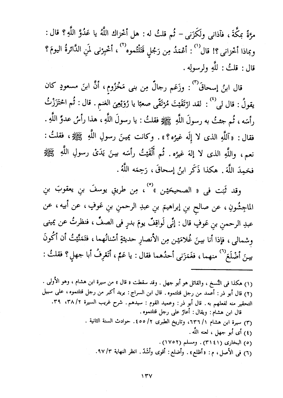 قَالَ ابْنُ إِسْحَاقَ: وَزَعَمَ رِجَالٌ مِنْ بَنِي مَخْزُومٍ، أَنَّ ابْنَ مَسْعُودٍ كَانَ يَقُولُ: قَالَ لِي: «لَقَدِ ارْتَقَيْتَ مُرْتَقًى صَعْبًا يَا رُوَيْعِيَّ الْغَنَمِ. قَالَ: ثُمَّ احْتَزَزْتُ رَأْسَهُ، ثُمَّ جِئْتُ بِهِ رَسُولَ اللَّهِ صَلَّى اللَّهُ عَلَيْهِ وَسَلَّمَ فَقَلْتُ: يَا رَسُولَ اللَّهِ، هَذَا رَأْسُ عَدُوِّ اللَّهِ. فَقَالَ: آللَّهِ الَّذِي لَا إِلَهَ غَيْرُهُ؟ وَكَانَتْ يَمِينُ رَسُولِ اللَّهِ صَلَّى اللَّهُ عَلَيْهِ وَسَلَّمَ فَقَلْتُ: نَعَمْ، وَاللَّهِ الَّذِي لَا إِلَهَ غَيْرُهُ. ثُمَّ أَلْقَيْتُ رَأْسَهُ بَيْنَ يَدَيْ رَسُولِ اللَّهِ فَحَمِدَ اللَّهَ.» هَكَذَا ذَكَرَ ابْنُ إِسْحَاقَ رَحِمَهُ اللَّهُ.