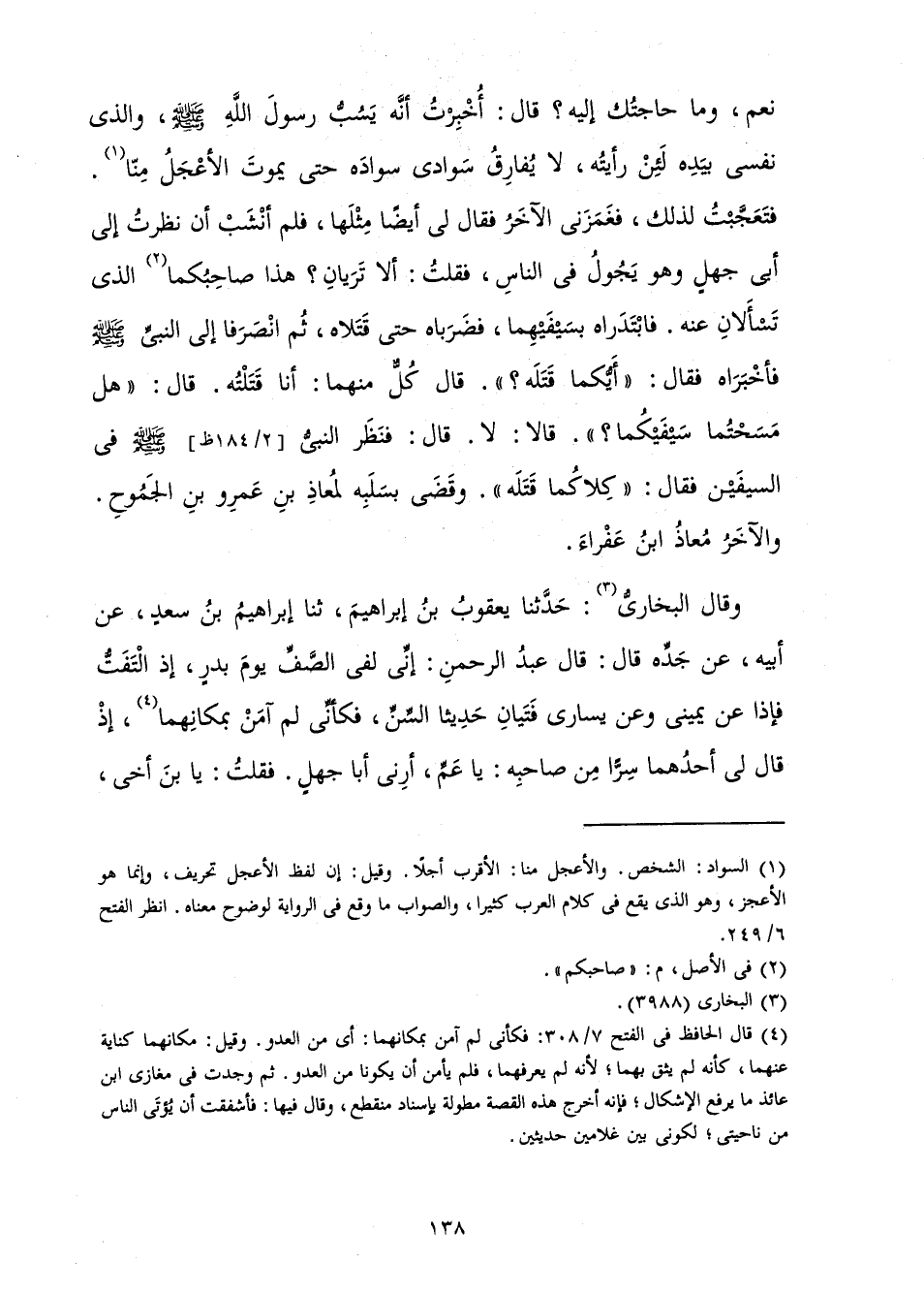 نَعَمْ، وَمَا حَاجَتُكَ إِلَيْهِ؟ قَالَ: أُخْبِرْتُ أَنَّهُ يَسُبُّ رَسُولَ اللَّهِ صَلَّى اللَّهُ عَلَيْهِ وَسَلَّمَ، وَالَّذِي نَفْسِي بِيَدِهِ لَئِنْ رَأَيْتُهُ، لَا يُفَارِقُ سَوَادِي سَوَادَهُ حَتَّى يَمُوتَ الْأَعْجَلُ مِنَّا، فَتَعَجَّبْتُ لِذَلِكَ، فَغَمَزَنِي الْآخَرُ فَقَالَ لِي أَيْضًا مِثْلَهَا، فَلَمْ أَنْشَبْ أَنْ نَظَرْتُ إِلَى أَبِي جَهْلٍ وَهُوَ يَجُولُ فِي النَّاسِ، فَقُلْتُ أَلَا تَرَيَانِ؟ هَذَا صَاحَبُكُمَا الَّذِي تَسْأَلَانِ عَنْهُ. فَابْتَدَرَاهُ بِسَيْفَيْهِمَا فَضَرَبَاهُ حَتَّى قَتَلَاهُ، ثُمَّ انْصَرَفَا إِلَى النَّبِيِّ صَلَّى اللَّهُ عَلَيْهِ وَسَلَّمَ فَأَخْبَرَاهُ فَقَالَ: أَيُّكُمَا قَتَلَهُ؟ قَالَ كُلٌّ مِنْهُمَا: أَنَا قَتَلْتُهُ. قَالَ: هَلْ مَسَحْتُمَا سَيْفَيْكُمَا؟ قَالَا: لَا. قَالَ: فَنَظَرَ النَّبِيُّ صَلَّى اللَّهُ عَلَيْهِ وَسَلَّمَ فِي السَّيْفَيْنِ فَقَالَ: كِلَاكُمَا قَتَلَهُ. وَقَضَى بِسَلَبِهِ لِمُعَاذِ بْنِ عَمْرِو بْنِ الْجَمُوحِ. وَالْآخَرُ مُعَاذُ ابْنُ عَفْرَاءَ.»