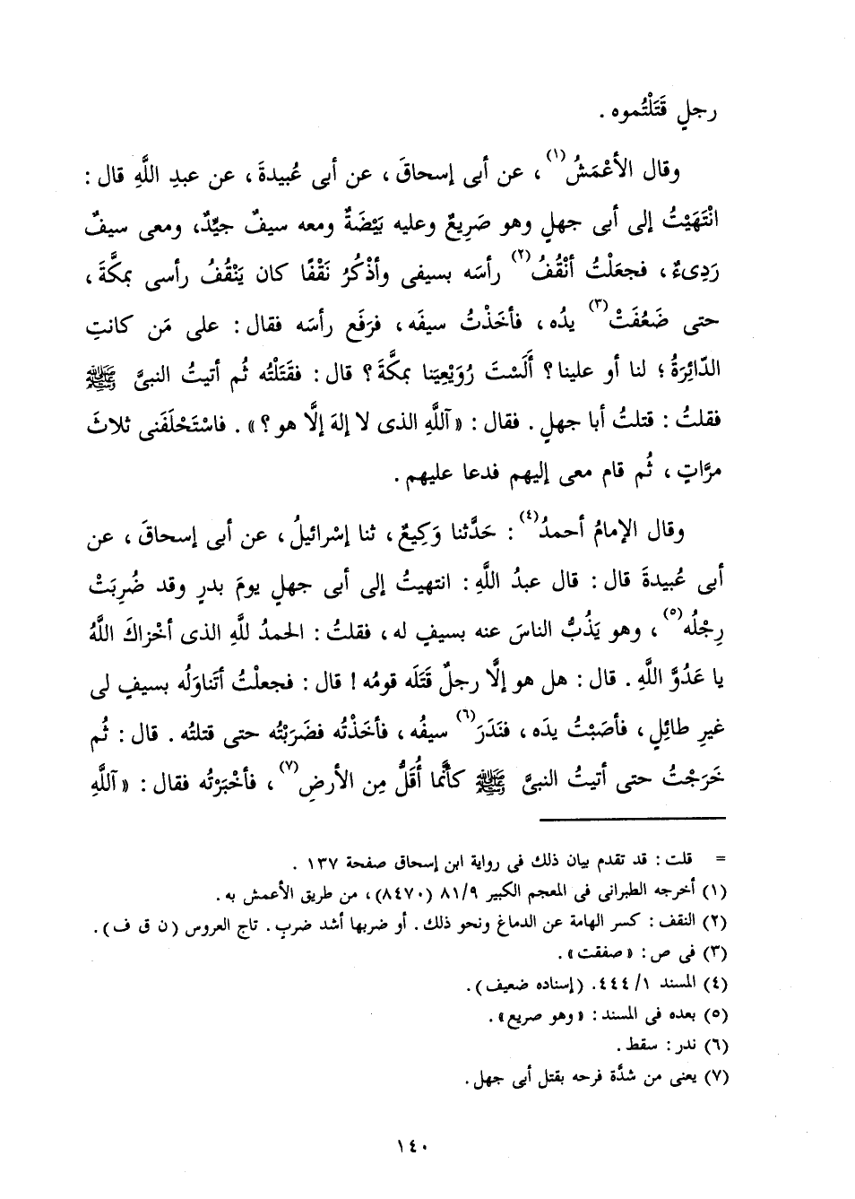 وَقَالَ الْأَعْمَشُ، عَنْ أَبِي إِسْحَاقَ، عَنْ أَبِي عُبَيْدَةَ، عَنْ عَبْدِ اللَّهِ قَالَ: «انْتَهَيْتُ إِلَى أَبِي جَهْلٍ وَهُوَ صَرِيعٌ وَعَلَيْهِ بَيْضَةٌ وَمَعَهُ سَيْفٌ جَيِّدٌ، وَمَعِي سَيْفٌ رَدِيءٌ، فَجَعَلْتُ أَنْقُفُ رَأْسَهُ بِسَيْفِي وَأَذْكُرُ نَقْفًا كَانَ يَنْقُفُ رَأْسِي بِمَكَّةَ، حَتَّى ضَعُفَتْ يَدُهُ، فَأَخَذْتُ سَيْفَهُ، فَرَفَعَ رَأْسَهُ فَقَالَ: عَلَى مَنْ كَانَتِ الدَّائِرَةُ، لَنَا أَوْ عَلَيْنَا؟ أَلَسْتَ رُوَيْعِيَنَا بِمَكَّةَ؟ قَالَ: فَقَتَلْتُهُ ثُمَّ أَتَيْتُ النَّبِيَّ صَلَّى اللَّهُ عَلَيْهِ وَسَلَّمَ فَقَلْتُ: قَتَلْتُ أَبَا جَهْلٍ فَقَالَ: آللَّهِ الَّذِي لَا إِلَهَ إِلَّا هُوَ؟ فَاسْتَحْلَفَنِي ثَلَاثَ مَرَّاتٍ، ثُمَّ قَامَ مَعِي إِلَيْهِمْ فَدَعَا عَلَيْهِمْ.»