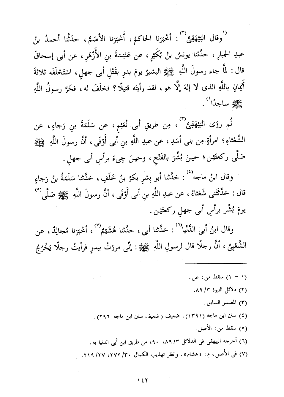 وَقَالَ الْبَيْهَقِيُّ: أَخْبَرَنَا الْحَاكِمُ، أَخْبَرَنَا الْأَصَمُّ، حَدَّثَنَا أَحْمَدُ بْنُ عَبْدِ الْجَبَّارِ، حَدَّثَنَا يُونُسُ بْنُ بُكَيْرٍ، عَنْ عَنْبَسَةَ بْنِ الْأَزْهَرِ، عَنْ أَبِي إِسْحَاقَ قَالَ: «لَمَّا جَاءَ رَسُولَ اللَّهِ صَلَّى اللَّهُ عَلَيْهِ وَسَلَّمَ الْبَشِيرُ يَوْمَ بَدْرٍ بِقَتْلِ أَبِي جَهْلٍ، اسْتَحْلَفَهُ ثَلَاثَةَ أَيْمَانٍ بِاللَّهِ الَّذِي لَا إِلَهَ إِلَّا هُوَ، لَقَدْ رَأَيْتَهُ قَتِيلًا؟ فَحَلَفَ لَهُ، فَخَرَّ رَسُولُ اللَّهِ صَلَّى اللَّهُ عَلَيْهِ وَسَلَّمَ سَاجِدًا.»
