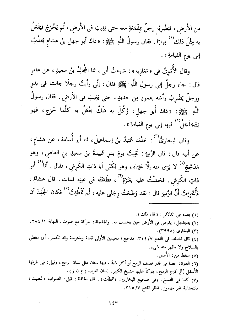 مِنَ الْأَرْضِ، فَيَضْرِبُهُ رَجُلٌ بِمِقْمَعَةٍ مَعَهُ حَتَّى يَغِيبَ فِي الْأَرْضِ، ثُمَّ يَخْرُجُ فَيَفْعَلُ بِهِ مِثْلَ ذَلِكَ مِرَارًا. فَقَالَ رَسُولُ اللَّهِ صَلَّى اللَّهُ عَلَيْهِ وَسَلَّمَ: ذَاكَ أَبُو جَهْلِ بْنُ هِشَامٍ يُعَذَّبُ إِلَى يَوْمِ الْقِيَامَةِ.»