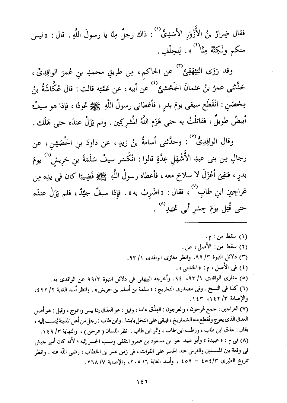 وَقَدْ رَوَى الْبَيْهَقِيُّ عَنِ الْحَاكِمِ، مِنْ طَرِيقِ مُحَمَّدِ بْنِ عُمَرَ الْوَاقِدِيِّ، حَدَّثَنِي عُمَرُ بْنُ عُثْمَانَ الْجَحْشِيُّ عَنْ أَبِيهِ، عَنْ عَمَّتِهِ قَالَتْ: «قَالَ عُكَّاشَةُ بْنُ مِحْصَنٍ: انْقَطَعَ سَيْفِي يَوْمَ بَدْرٍ، فَأَعْطَانِي رَسُولُ اللَّهِ صَلَّى اللَّهُ عَلَيْهِ وَسَلَّمَ عُودًا، فَإِذَا هُوَ سَيْفٌ أَبْيَضُ طَوِيلٌ، فَقَاتَلْتُ بِهِ حَتَّى هَزَمَ اللَّهُ الْمُشْرِكِينَ. وَلَمْ يَزَلْ عِنْدَهُ حَتَّى هَلَكَ.»