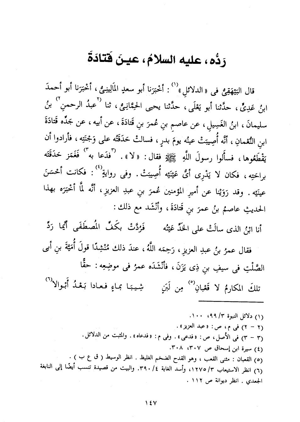 قَالَ الْبَيْهَقِيُّ فِي " الدَّلَائِلِ ": أَخْبَرَنَا أَبُو سَعْدٍ الْمَالِينِيُّ، أَخْبَرَنَا أَبُو أَحْمَدَ بْنُ عَدِيٍّ، حَدَّثَنَا أَبُو يَعْلَى، حَدَّثَنَا يَحْيَى الْحِمَّانِيُّ، ثَنَا عَبْدُ الرَّحْمَنِ بْنُ سُلَيْمَانَ، ابْنُ الْغَسِيلِ، عَنْ عَاصِمِ بْنِ عُمَرَ بْنِ قَتَادَةَ، عَنْ أَبِيهِ، عَنْ جَدِّهِ قَتَادَةَ بْنِ النُّعْمَانِ، أَنَّهُ «أُصِيبَتْ عَيْنُهُ يَوْمَ بَدْرٍ، فَسَالَتْ حَدَقَتُهُ عَلَى وَجْنَتِهِ، فَأَرَادُوا أَنْ يَقْطَعُوهَا، فَسَأَلُوا رَسُولَ اللَّهِ صَلَّى اللَّهُ عَلَيْهِ وَسَلَّمَ فَقَالَ: لَا. فَدَعَا بِهِ فَغَمَزَ حَدَقَتَهُ بِرَاحَتِهِ، فَكَانَ لَا يَدْرِي أَيَّ عَيْنَيْهِ أُصِيبَتْ. وَفِي رِوَايَةٍ: فَكَانَتْ أَحْسَنَ عَيْنَيْهِ.» وَقَدْ رَوَيْنَا عَنْ أَمِيرِ الْمُؤْمِنِينَ عُمَرَ بْنِ عَبْدِ الْعَزِيزِ، أَنَّهُ لَمَّا أَخْبَرَهُ بِهَذَا الْحَدِيثِ عَاصِمُ بْنُ عُمَرَ بْنِ قَتَادَةَ، وَأَنْشَدَ مَعَ ذَلِكَ: