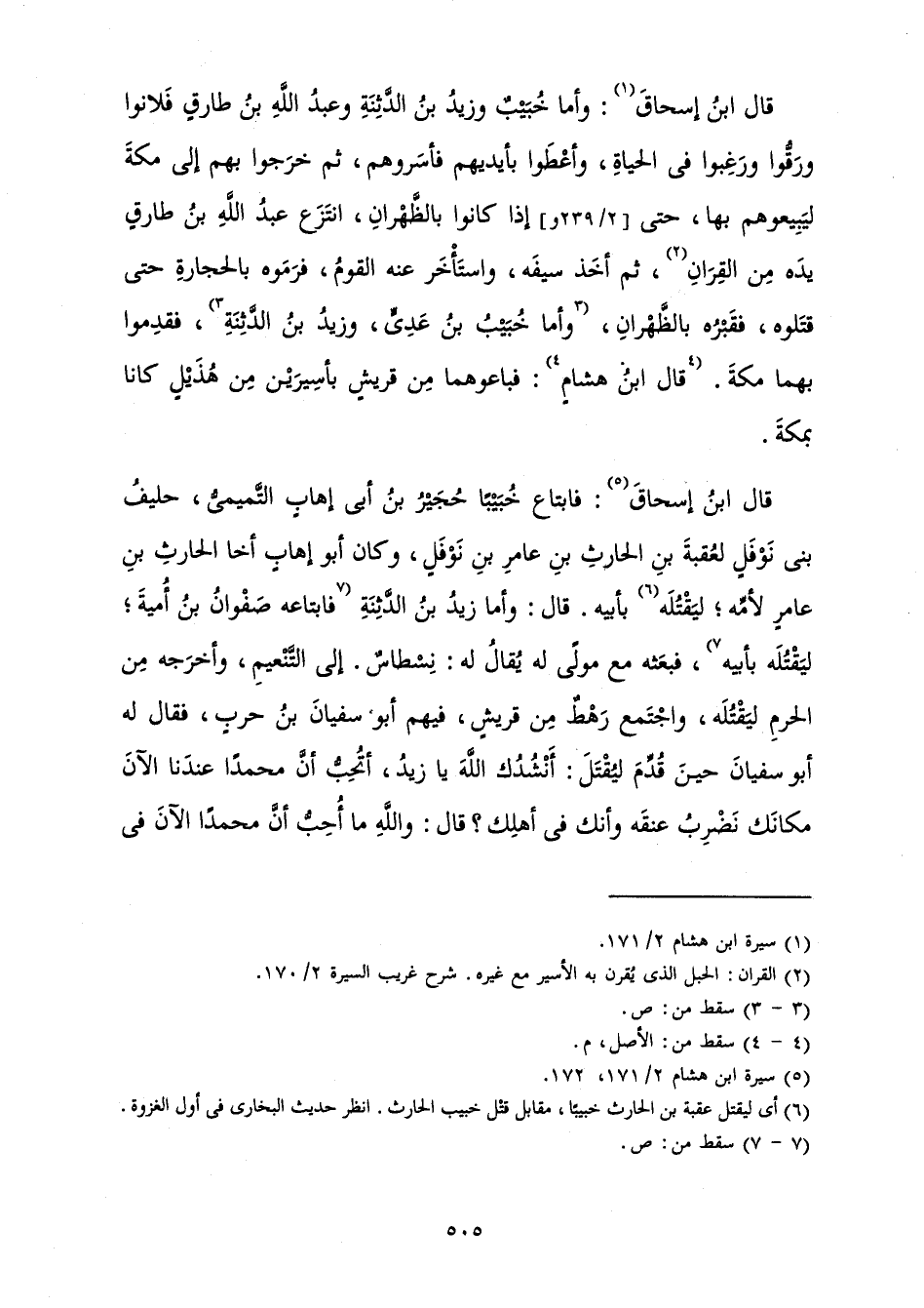 قَالَ ابْنُ إِسْحَاقَ: فَابْتَاعَ خُبَيْبًا، حُجَيْرُ بْنُ أَبِي إِهَابٍ التَّمِيمِيُّ حَلِيفُ بَنِي نَوْفَلٍ لِعُقْبَةَ بْنِ الْحَارِثِ بْنِ عَامِرِ بْنِ نَوْفَلٍ، وَكَانَ أَبُو إِهَابٍ أَخَا الْحَارِثِ بْنِ عَامِرٍ لِأُمِّهِ ; لِيَقْتُلَهُ بِأَبِيهِ. قَالَ: وَأَمَّا زَيْدُ بْنُ الدَّثِنَةِ فَابْتَاعَهُ صَفْوَانُ بْنُ أُمَيَّةَ، ; لِيَقْتُلَهُ بِأَبِيهِ، فَبَعَثَهُ مَعَ مَوْلًى لَهُ يُقَالُ لَهُ: نِسْطَاسٌ. إِلَى التَّنْعِيمِ، وَأَخْرَجَهُ مِنَ الْحَرَمِ لِيَقْتُلَهُ، وَاجْتَمَعَ رَهْطٌ مِنْ قُرَيْشٍ فِيهِمْ أَبُو سُفْيَانَ بْنُ حَرْبٍ فَقَالَ لَهُ أَبُو سُفْيَانَ حِينَ قُدِّمَ لِيُقْتَلَ: أَنْشُدُكَ اللَّهَ يَا زَيْدُ، أَتُحِبُّ أَنَّ مُحَمَّدًا عِنْدَنَا الْآنَ مَكَانَكَ نَضْرِبُ عُنُقَهُ، وَأَنَّكَ فِي أَهْلِكَ؟ قَالَ: وَاللَّهِ مَا أُحِبُّ أَنَّ مُحَمَّدًا الْآنَ فِي