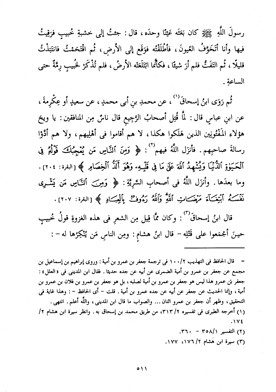 ثُمَّ رَوَى ابْنُ إِسْحَاقَ، عَنْ مُحَمَّدِ بْنِ أَبِي مُحَمَّدٍ، عَنْ سَعِيدٍ، أَوْ عِكْرِمَةَ عَنِ ابْنِ عَبَّاسٍ قَالَ: لَمَّا قُتِلَ أَصْحَابُ الرَّجِيعِ قَالَ نَاسٌ مِنَ الْمُنَافِقِينَ: يَا وَيْحَ هَؤُلَاءِ الْمَفْتُونِينَ الَّذِينَ هَلَكُوا هَكَذَا، لَا هُمْ أَقَامُوا فِي أَهْلِيهِمْ وَلَا هُمْ أَدَّوْا رِسَالَةَ صَاحِبِهِمْ. فَأَنْزَلُ اللَّهُ فِيهِمْ: {وَمِنَ النَّاسِ مَنْ يُعْجِبُكَ قَوْلُهُ فِي الْحَيَاةِ الدُّنْيَا وَيُشْهِدُ اللَّهَ عَلَى مَا فِي قَلْبِهِ وَهُوَ أَلَدُّ الْخِصَامِ} [البقرة: 204] وَمَا بَعْدَهَا. وَأَنْزَلَ اللَّهُ فِي أَصْحَابِ السَّرِيَّةِ: {وَمِنَ النَّاسِ مَنْ يَشْرِي نَفْسَهُ ابْتِغَاءَ مَرْضَاةِ اللَّهِ وَاللَّهُ رَءُوفٌ بِالْعِبَادِ} [البقرة: 207]