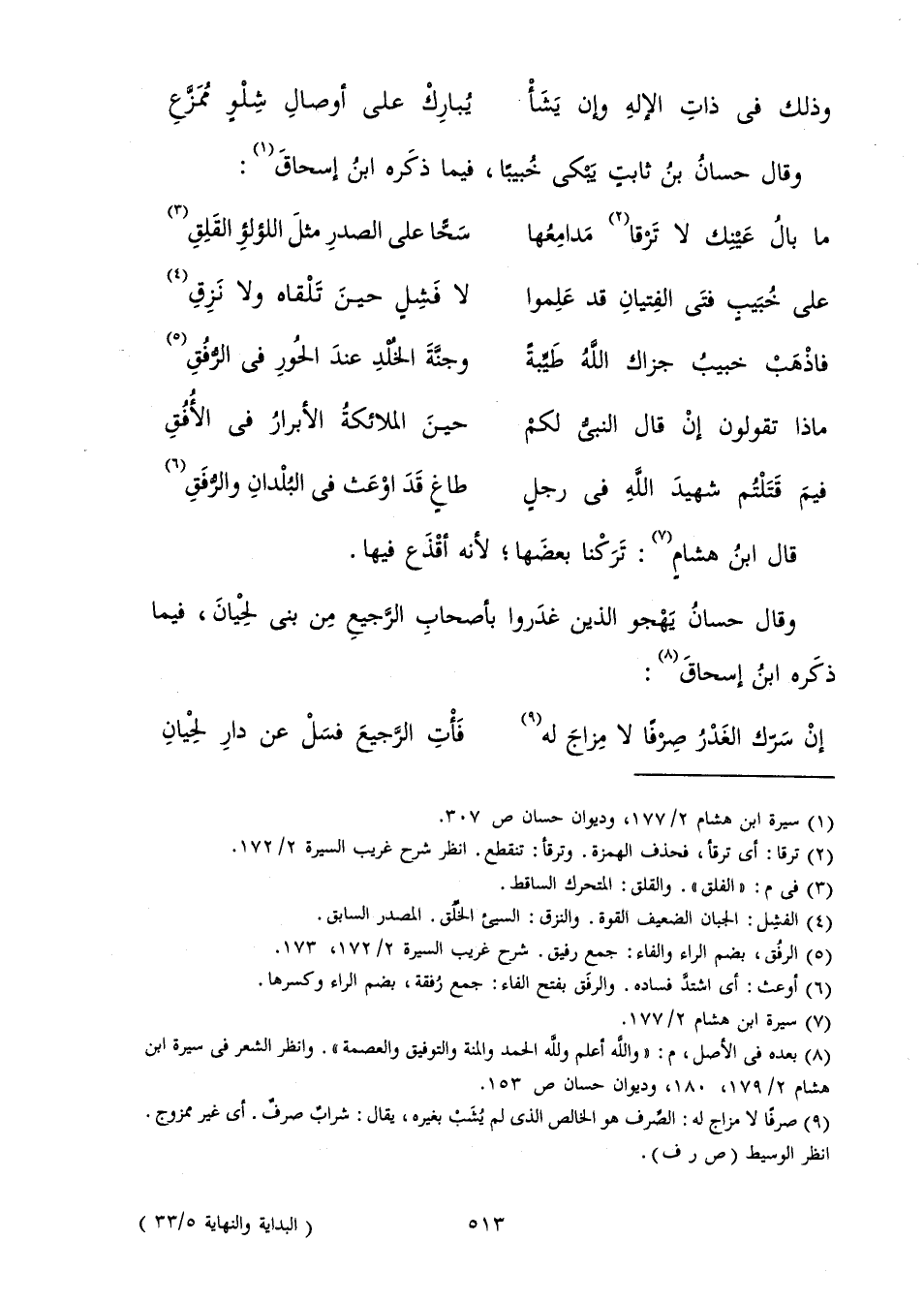 وَقَالَ حَسَّانُ بْنُ ثَابِتٍ يَبْكِي خُبَيْبًا فِيمَا ذَكَرَهُ ابْنُ إِسْحَاقَ: