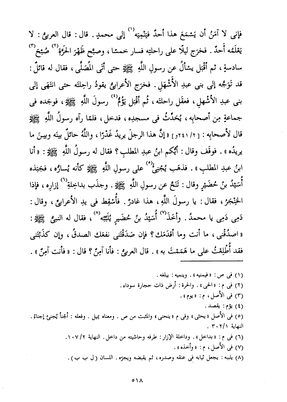 فَإِنِّي لَا آمَنُ أَنْ يَسْمَعَ هَذَا أَحَدٌ فَيَنْمِيَهُ إِلَى مُحَمَّدٍ. قَالَ: قَالَ الْعَرَبِيُّ: لَا يَعْلَمُهُ أَحَدٌ. فَخَرَجَ لَيْلًا عَلَى رَاحِلَتِهِ فَسَارَ خَمْسًا، وَصَبَّحَ ظَهْرَ الْحَرَّةِ صُبْحَ سَادِسَةٍ، ثُمَّ أَقْبَلَ يَسْأَلُ عَنْ رَسُولِ اللَّهِ صَلَّى اللَّهُ عَلَيْهِ وَسَلَّمَ حَتَّى أَتَى الْمُصَلَّى، فَقَالَ لَهُ قَائِلٌ: قَدْ تَوَجَّهَ إِلَى بَنِي عَبْدِ الْأَشْهَلِ. فَخَرَجَ الْأَعْرَابِيُّ يَقُودُ رَاحِلَتَهُ حَتَّى انْتَهَى إِلَى بَنِي عَبْدِ الْأَشْهَلِ فَعَقَلَ رَاحِلَتَهُ، ثُمَّ أَقْبَلُ يَؤُمُّ رَسُولَ اللَّهِ صَلَّى اللَّهُ عَلَيْهِ وَسَلَّمَ، فَوَجَدَهُ فِي جَمَاعَةٍ مِنْ أَصْحَابِهِ، يُحَدِّثُ فِي مَسْجِدِهِ، فَدَخَلَ فَلَمَّا رَآهُ رَسُولُ اللَّهِ صَلَّى اللَّهُ عَلَيْهِ وَسَلَّمَ قَالَ لِأَصْحَابِهِ: إِنَّ هَذَا الرَّجُلَ يُرِيدُ غَدْرًا، وَاللَّهُ حَائِلٌ بَيْنَهُ وَبَيْنَ مَا يُرِيدُهُ. فَوَقَفَ وَقَالَ: أَيُّكُمُ ابْنُ عَبْدِ الْمُطَّلِبِ؟ فَقَالَ لَهُ رَسُولُ اللَّهِ صَلَّى اللَّهُ عَلَيْهِ وَسَلَّمَ: أَنَا ابْنُ عَبْدِ الْمُطَّلِبِ فَذَهَبَ يُجْنِئُ عَلَى رَسُولِ اللَّهِ صَلَّى اللَّهُ عَلَيْهِ وَسَلَّمَ كَأَنَّهُ يُسَارُّهُ، فَجَبَذَهُ أُسَيْدُ بْنُ حُضَيْرٍ وَقَالَ: تَنَحَّ عَنْ رَسُولِ اللَّهِ صَلَّى اللَّهُ عَلَيْهِ وَسَلَّمَ. وَجَذَبَ بِدَاخِلَةِ إِزَارِهِ، فَإِذَا الْخِنْجَرُ، فَقَالَ: يَا رَسُولَ اللَّهِ، هَذَا غَادِرٌ. فَأُسْقِطَ فِي يَدِ الْأَعْرَابِيِّ، وَقَالَ: دَمِي دَمِي يَا مُحَمَّدُ. وَأَخَذَ أُسَيْدُ بْنُ حُضَيْرٍ يُلَبِّبُهُ، فَقَالَ لَهُ النَّبِيُّ صَلَّى اللَّهُ عَلَيْهِ وَسَلَّمَ: اصْدُقْنِي، مَا أَنْتَ وَمَا أَقْدَمَكَ؟ فَإِنْ صَدَقْتَنِي نَفَعَكَ الصِّدْقُ، وَإِنْ كَذَبْتَنِي فَقَدْ أُطْلِعْتُ عَلَى مَا هَمَمْتَ بِهِ. قَالَ الْعَرَبِيُّ: فَأَنَا آمِنٌ؟ قَالَ: فَأَنْتَ آمِنٌ