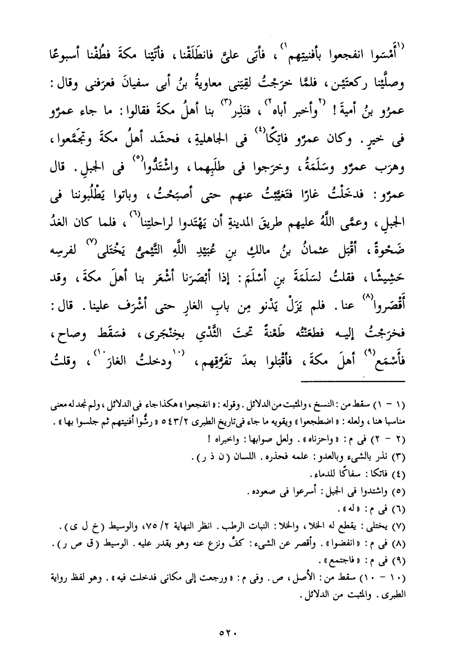 أَمْسَوْا انْفَجَعُوا بِأَفْنِيَتِهِمْ، فَأَبَى عَلَيَّ فَانْطَلَقْنَا فَأَتَيْنَا مَكَّةَ فَطُفْنَا أُسْبُوعًا وَصَلَّيْنَا رَكْعَتَيْنِ، فَلَمَّا خَرَجْتُ لَقِيَنِي مُعَاوِيَةُ بْنُ أَبِي سُفْيَانَ فَعَرَفَنِي وَقَالَ: عَمْرُو بْنُ أُمَيَّةَ! وَأَخْبَرَ أَبَاهُ فَنَذِرَ بِنَا أَهْلُ مَكَّةَ فَقَالُوا: مَا جَاءَ عَمْرٌو فِي خَيْرٍ. وَكَانَ عَمْرٌو فَاتِكًا فِي الْجَاهِلِيَّةِ، فَحَشَدَ أَهْلُ مَكَّةَ وَتَجَمَّعُوا، وَهَرَبَ عَمْرٌو، وَسَلَمَةُ وَخَرَجُوا فِي طَلَبِهِمَا، وَاشْتَدُّوا فِي الْجَبَلِ. قَالَ عَمْرٌو: فَدَخَلْتُ غَارًا فَتَغَيَّبْتُ عَنْهُمْ حَتَّى أَصْبَحْتُ، وَبَاتُوا يَطْلُبُونَنَا فِي الْجَبَلِ، وَعَمَّى اللَّهُ عَلَيْهِمْ طَرِيقَ الْمَدِينَةِ أَنْ يَهْتَدُوا لِرَاحِلَتِنَا، فَلَّمَا كَانَ الْغَدُ ضَحْوَةً، أَقْبَلَ عُثْمَانُ بْنُ مَالِكِ بْنِ عُبَيْدٍ التَّيْمِيُّ يَخْتَلِي لِفَرَسِهِ حَشِيشًا، فَقُلْتُ لِسَلَمَةَ بْنِ أَسْلَمَ: إِذَا أَبْصَرَنَا أَشْعَرَ بِنَا أَهْلَ مَكَّةَ وَقَدِ انْفَضُّوا عَنَّا. فَلَمْ يَزَلْ يَدْنُو مِنْ بَابِ الْغَارِ حَتَّى أَشْرَفَ عَلَيْنَا. قَالَ: فَخَرَجْتُ إِلَيْهِ فَطَعَنْتُهُ طَعْنَةً تَحْتَ الثَّدْيِ بِخِنْجَرِي فَسَقَطَ وَصَاحَ، فَأَسْمَعَ أَهْلَ مَكَّةَ فَأَقْبَلُوا بَعْدَ تَفَرُّقِهِمْ، وَدَخَلْتُ الْغَارَ، وَقُلْتُ