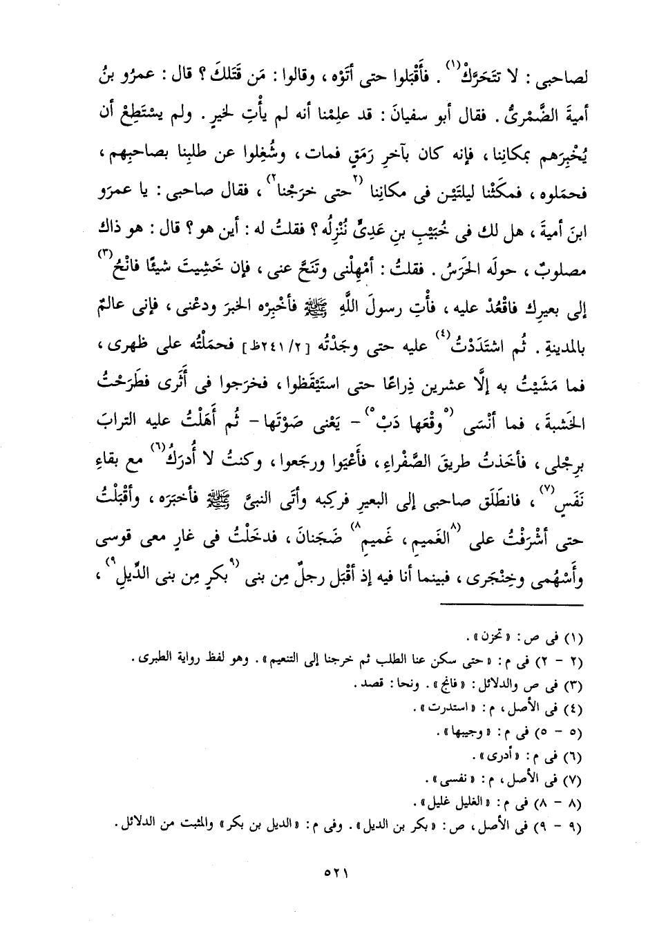 لِصَاحِبِي: لَا تَتَحَرَّكْ. فَأَقْبَلُوا حَتَّى أَتَوْهُ، وَقَالُوا: مَنْ قَتَلَكَ؟ قَالَ: عَمْرُو بْنُ أُمَيَّةَ الضَّمْرِيُّ. فَقَالَ أَبُو سُفْيَانَ: قَدْ عَلِمْنَا أَنَّهُ لَمْ يَأْتِ لِخَيْرٍ. وَلَمْ يَسْتَطِعْ أَنْ يُخْبِرَهُمْ بِمَكَانِنَا، فَإِنَّهُ كَانَ بِآخِرِ رَمَقٍ فَمَاتَ، وَشُغِلُوا عَنْ طَلَبِنَا بِصَاحِبِهِمْ، فَحَمَلُوهُ، فَمَكَثْنَا لَيْلَتَيْنِ فِي مَكَانِنَا حَتَّى خَرَجْنَا، فَقَالَ صَاحِبِي: يَا عَمْرُو بْنَ أُمَيَّةَ هَلْ لَكَ فِي خُبَيْبِ بْنِ عَدِيٍّ نَنْزِلُهُ؟ فَقُلْتُ لَهُ: أَيْنَ هُوَ؟ قَالَ: هُوَ ذَاكَ مَصْلُوبٌ، حَوْلَهُ الْحَرَسُ. فَقُلْتُ: أَمْهِلْنِي وَتَنَحَّ عَنِّي فَإِنْ خَشِيتَ شَيْئًا فَانْحُ إِلَى بَعِيرِكَ فَاقْعُدْ عَلَيْهِ، فَأْتِ رَسُولَ اللَّهِ صَلَّى اللَّهُ عَلَيْهِ وَسَلَّمَ فَأَخْبِرْهُ الْخَبَرَ وَدَعْنِي، فَإِنِّي عَالِمٌ بِالْمَدِينَةِ. ثُمَّ اشْتَدَدْتُ عَلَيْهِ حَتَّى وَجَدْتُهُ فَحَمَلْتُهُ عَلَى ظَهْرِي، فَمَا مَشَيْتُ بِهِ إِلَّا عِشْرِينَ ذِرَاعًا حَتَّى اسْتَيْقَظُوا، فَخَرَجُوا فِي أَثَرِي فَطَرَحْتُ الْخَشَبَةَ، فَمَا أَنْسَى وَقْعَهَا دَبْ - يَعْنِي صَوْتَهَا - ثُمَّ أَهَلْتُ عَلَيْهِ التُّرَابَ بِرِجْلِي، فَأَخَذْتُ طَرِيقَ الصَّفْرَاءِ، فَأَعْيَوْا وَرَجَعُوا، وَكُنْتُ لَا أُدْرَكُ مَعَ بَقَاءِ نَفْسٍ، فَانْطَلَقَ صَاحِبِي إِلَى الْبَعِيرِ فَرَكِبَهُ وَأَتَى النَّبِيَّ صَلَّى اللَّهُ عَلَيْهِ وَسَلَّمَ فَأَخْبَرَهُ، وَأَقْبَلْتُ حَتَّى أَشْرَفْتُ عَلَى الْغَمِيمِ غَمِيمِ ضَجَنَانَ فَدَخَلْتُ فِي غَارٍ مَعِي قَوْسِي وَأَسْهُمِي وَخِنْجَرِي، فَبَيْنَمَا أَنَا فِيهِ إِذْ أَقْبَلَ رَجُلٌ مِنْ بَنِي بَكْرٍ مِنْ بَنِي الدِّيلِ