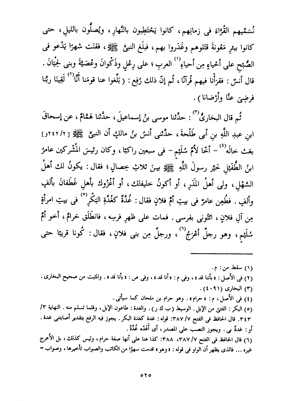 ثُمَّ قَالَ الْبُخَارِيُّ: حَدَّثَنَا مُوسَى بْنُ إِسْمَاعِيلَ، حَدَّثَنَا هَمَّامٌ، عَنْ إِسْحَاقَ بْنِ عَبْدِ اللَّهِ بْنِ أَبِي طَلْحَةَ، حَدَّثَنِي أَنَسُ بْنُ مَالِكٍ «أَنَّ النَّبِيَّ صَلَّى اللَّهُ عَلَيْهِ وَسَلَّمَ بَعَثَ خَالَهُ - أَخًا لِأُمِّ سُلَيْمٍ - فِي سَبْعِينَ رَاكِبًا، وَكَانَ رَئِيسَ الْمُشْرِكِينَ عَامِرُ بْنُ الطُّفَيْلِ خَيَّرَ رَسُولَ اللَّهِ صَلَّى اللَّهُ عَلَيْهِ وَسَلَّمَ بَيْنَ ثَلَاثِ خِصَالٍ ; فَقَالَ: يَكُونُ لَكَ أَهْلُ السَّهْلِ وَلِي أَهْلُ الْمَدَرِ أَوْ أَكُونُ خَلِيفَتَكَ، أَوْ أَغْزُوكَ بِأَهْلِ غَطَفَانَ بِأَلْفٍ وَأَلْفٍ. فَطُعِنَ عَامِرٌ فِي بَيْتِ أُمِّ فُلَانٍ فَقَالَ: غُدَّةٌ كَغُدَّةِ الْبَكْرِ فِي بَيْتِ امْرَأَةٍ مِنْ آلِ فُلَانٍ، ائْتُونِي بِفَرَسِي. فَمَاتَ عَلَى ظَهْرِ فَرَسِهِ، فَانْطَلَقَ حَرَامٌ أَخُو أُمِّ سُلَيْمٍ وَهُوَ رَجُلٌ أَعْرَجُ، وَرَجُلٌ مِنْ بَنِي فُلَانٍ، فَقَالَ: كُونَا قَرِيبًا حَتَّى