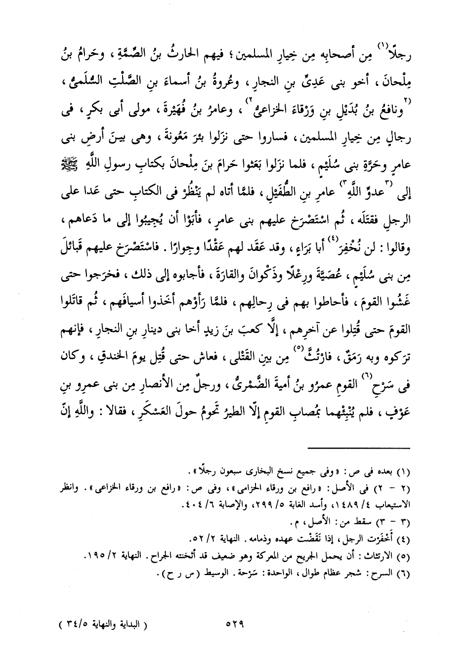 رَجُلًا مِنْ أَصْحَابِهِ مِنْ خِيَارِ الْمُسْلِمِينَ ; فِيهِمُ الْحَارِثُ بْنُ الصِّمَّةِ، وَحَرَامُ بْنُ مِلْحَانَ أَخُو بَنِي عَدِيِّ بْنِ النَّجَّارِ، وَعُرْوَةُ بْنُ أَسْمَاءَ بْنِ الصَّلْتِ السُّلَمِيُّ، وَنَافِعُ بْنُ بُدَيْلِ بْنِ وَرْقَاءَ الْخُزَاعِيُّ، وَعَامِرُ بْنُ فُهَيْرَةَ، مَوْلَى أَبِي بَكْرٍ فِي رِجَالٍ مِنْ خِيَارِ الْمُسْلِمِينَ، فَسَارُوا حَتَّى نَزَلُوا بِئْرَ مَعُونَةَ وَهِيَ بَيْنَ أَرْضِ بَنِي عَامِرٍ وَحَرَّةِ بَنِي سُلَيْمٍ فَلَمَّا نَزَلُوا بَعَثُوا حَرَامَ بْنَ مِلْحَانَ بِكَتَابِ رَسُولِ اللَّهِ صَلَّى اللَّهُ عَلَيْهِ وَسَلَّمَ إِلَى عَدُوِّ اللَّهِ عَامِرِ بْنِ الطُّفَيْلِ، فَلَمَّا أَتَاهُ لَمْ يَنْظُرْ فِي الْكِتَابِ حَتَّى عَدَا عَلَى الرَّجُلِ فَقَتَلَهُ، ثُمَّ اسْتَصْرَخَ عَلَيْهِمْ بَنِي عَامِرٍ فَأَبَوْا أَنْ يُجِيبُوا إِلَى مَا دَعَاهُمْ، وَقَالُوا: لَنْ نُخْفِرَ أَبَا بَرَاءٍ وَقَدْ عَقَدَ لَهُمْ عَقْدًا وَجِوَارًا. فَاسْتَصْرَخَ عَلَيْهِمْ قَبَائِلَ مِنْ بَنِي سُلَيْمٍ: عُصَيَّةَ وَرِعْلًا وَذَكْوَانَ وَالْقَارَةَ، فَأَجَابُوهُ إِلَى ذَلِكَ، فَخَرَجُوا حَتَّى غَشُوا الْقَوْمَ، فَأَحَاطُوا بِهِمْ فِي رِحَالِهِمْ، فَلَمَّا رَأَوْهُمْ أَخَذُوا أَسْيَافَهُمْ، ثُمَّ قَاتَلُوا الْقَوْمَ حَتَّى قُتِلُوا عَنْ آخِرِهِمْ، إِلَّا كَعْبَ بْنَ زَيْدٍ أَخَا بَنِي دِينَارِ بْنِ النَّجَّارِ، فَإِنَّهُمْ تَرَكُوهُ بِهِ رَمَقٌ، فَارْتُثَّ مِنْ بَيْنِ الْقَتْلَى، فَعَاشَ حَتَّى قُتِلَ يَوْمَ الْخَنْدَقِ، وَكَانَ فِي سَرْحِ الْقَوْمِ عَمْرُو بْنُ أُمَيَّةَ الضَّمْرِيُّ وَرَجُلٌ مِنَ الْأَنْصَارِ مِنْ بَنِي عَمْرِو بْنِ عَوْفٍ فَلَمْ يُنْبِئْهُمَا بِمُصَابِ الْقَوْمِ إِلَّا الطَّيْرُ تَحُومُ حَوْلَ الْعَسْكَرِ، فَقَالَا: وَاللَّهِ إِنَّ