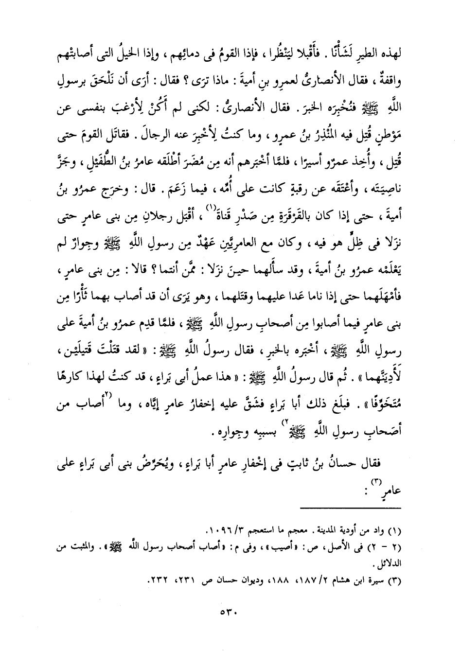 لِهَذِهِ الطَّيْرِ لَشَأْنًا. فَأَقْبَلَا لِيَنْظُرَا، فَإِذَا الْقَوْمُ فِي دِمَائِهِمْ، وَإِذَا الْخَيْلُ الَّتِي أَصَابَتْهُمْ وَاقِفَةٌ، فَقَالَ الْأَنْصَارِيُّ لِعَمْرِو بْنِ أُمَيَّةَ: مَاذَا تَرَى؟ فَقَالَ: أَرَى أَنْ نَلْحَقَ بِرَسُولِ اللَّهِ صَلَّى اللَّهُ عَلَيْهِ وَسَلَّمَ فَنُخْبِرَهُ الْخَبَرَ. فَقَالَ الْأَنْصَارِيُّ: لَكِنِّي لَمْ أَكُنْ لِأَرْغَبَ بِنَفْسِي عَنْ مَوْطِنٍ قُتِلَ فِيهِ الْمُنْذِرُ بْنُ عَمْرٍو، وَمَا كُنْتُ لِأُخْبِرَ عَنْهُ الرِّجَالَ. فَقَاتَلَ الْقَوْمَ حَتَّى قُتِلَ، وَأُخِذَ عَمْرٌو أَسِيرًا، فَلَمَّا أَخْبَرَهُمْ أَنَّهُ مِنْ مُضَرَ أُطْلَقَهُ عَامِرُ بْنُ الطُّفَيْلِ وَجَزَّ نَاصِيَتَهُ، وَأَعْتَقَهُ عَنْ رَقَبَةٍ كَانَتْ عَلَى أُمِّهِ، فِيمَا زَعَمَ. قَالَ: وَخَرَجَ عَمْرُو بْنُ أُمَيَّةَ حَتَّى إِذَا كَانَ بِالْقَرْقَرَةِ مِنْ صَدْرِ قَنَاةَ، أَقْبَلَ رَجُلَانِ مِنْ بَنِي عَامِرٍ حَتَّى نَزَلَا فِي ظِلٍّ هُوَ فِيهِ، وَكَانَ مَعَ الْعَامِرِيَّيْنِ عَهْدٌ مِنْ رَسُولِ اللَّهِ صَلَّى اللَّهُ عَلَيْهِ وَسَلَّمَ وَجِوَارٌ لَمْ يَعْلَمْهُ عَمْرُو بْنُ أُمَيَّةَ، وَقَدْ سَأَلَهُمَا حِينَ نَزَلَا: مِمَّنْ أَنْتُمَا؟ قَالَا: مِنْ بَنِي عَامِرٍ فَأَمْهَلَهُمَا حَتَّى إِذَا نَامَا عَدَا عَلَيْهِمَا وَقَتَلَهُمَا، وَهُوَ يَرَى أَنْ قَدْ أَصَابَ بِهِمَا ثَأْرًا مِنْ بَنِي عَامِرٍ فِيمَا أَصَابُوا مِنْ أَصْحَابِ رَسُولِ اللَّهِ صَلَّى اللَّهُ عَلَيْهِ وَسَلَّمَ، فَلَمَّا قَدِمَ عَمْرُو بْنُ أُمَيَّةَ عَلَى رَسُولِ اللَّهِ صَلَّى اللَّهُ عَلَيْهِ وَسَلَّمَ، أَخْبَرَهُ بِالْخَبَرِ، فَقَالَ رَسُولُ اللَّهِ صَلَّى اللَّهُ عَلَيْهِ وَسَلَّمَ: لَقَدْ قَتَلْتَ قَتِيلَيْنِ، لَأَدِيَنَّهُمَا. ثُمَّ قَالَ رَسُولُ اللَّهِ صَلَّى اللَّهُ عَلَيْهِ وَسَلَّمَ هَذَا عَمَلُ أَبِي بَرَاءٍ قَدْ كُنْتُ لِهَذَا كَارِهًا مُتَخَوِّفًا. فَبَلَغَ ذَلِكَ أَبَا بَرَاءٍ فَشَقَّ عَلَيْهِ إِخْفَارُ عَامِرٍ إِيَّاهُ، وَمَا أَصَابَ مِنْ أَصْحَابِ رَسُولِ اللَّهِ صَلَّى اللَّهُ عَلَيْهِ وَسَلَّمَ بِسَبَبِهِ وَجِوَارِهِ.