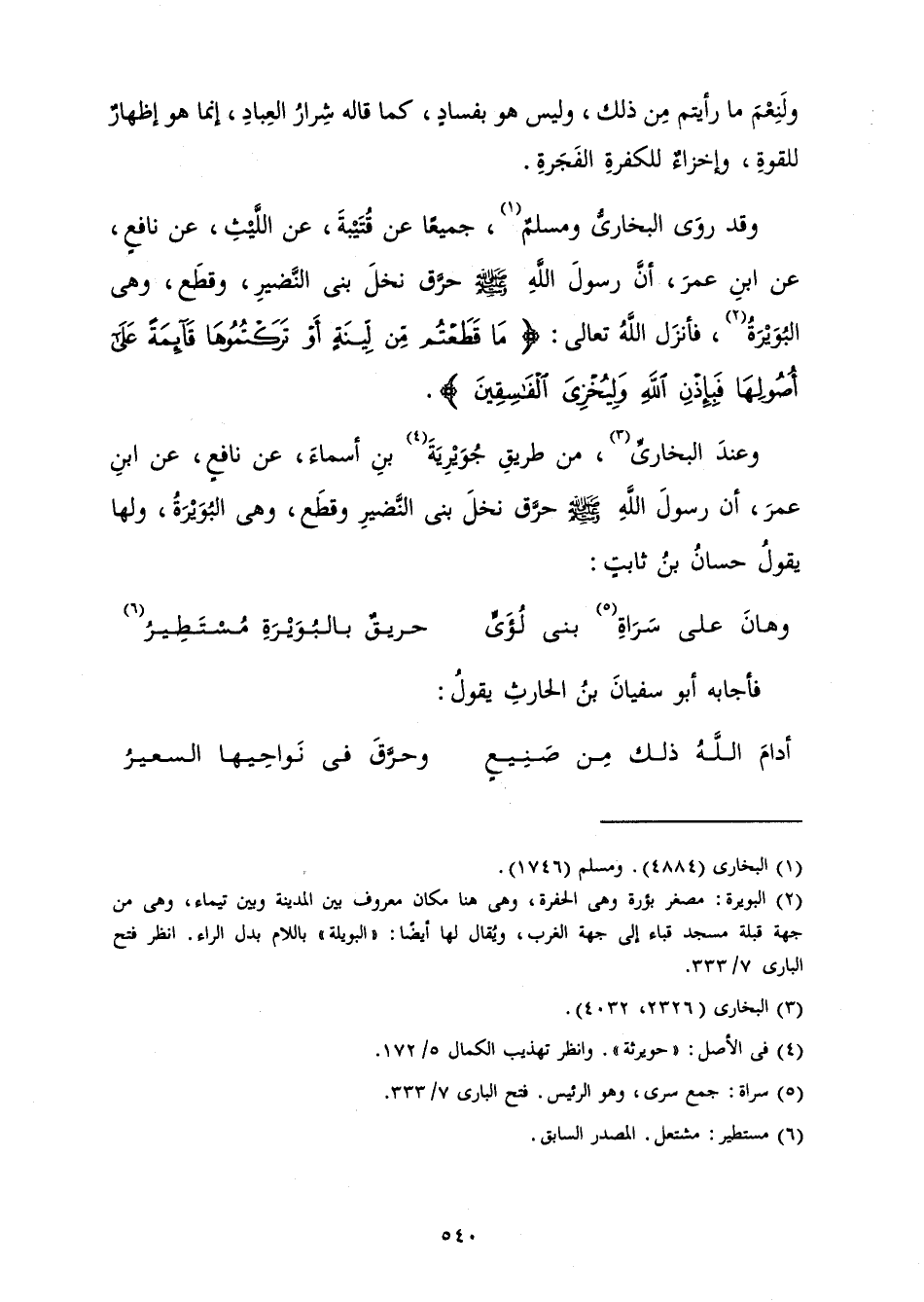 وَقَدْ رَوَى الْبُخَارِيُّ، وَمُسْلِمٌ جَمِيعًا عَنْ قُتَيْبَةَ، عَنِ اللَّيْثِ، عَنْ نَافِعٍ، «عَنِ ابْنِ عُمَرَ أَنَّ رَسُولَ اللَّهِ صَلَّى اللَّهُ عَلَيْهِ وَسَلَّمَ حَرَّقَ نَخْلَ بَنِي النَّضِيرِ وَقَطَعَ، وَهِيَ الْبُوَيْرَةُ، فَأَنْزَلَ اللَّهُ تَعَالَى: {مَا قَطَعْتُمْ مِنْ لِينَةٍ أَوْ تَرَكْتُمُوهَا قَائِمَةً عَلَى أُصُولِهَا فَبِإِذْنِ اللَّهِ وَلِيُخْزِيَ الْفَاسِقِينَ} [الحشر: 5] »